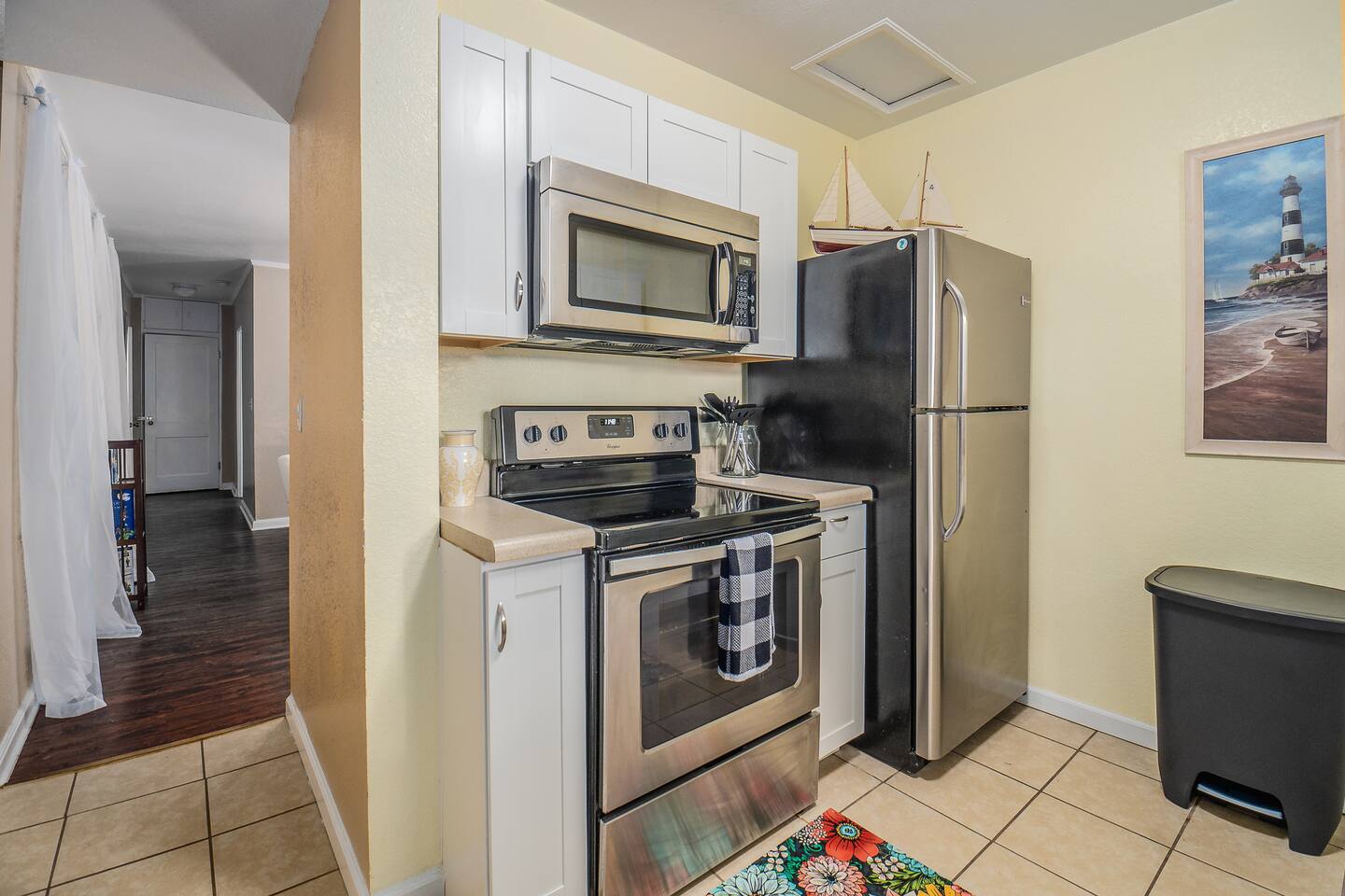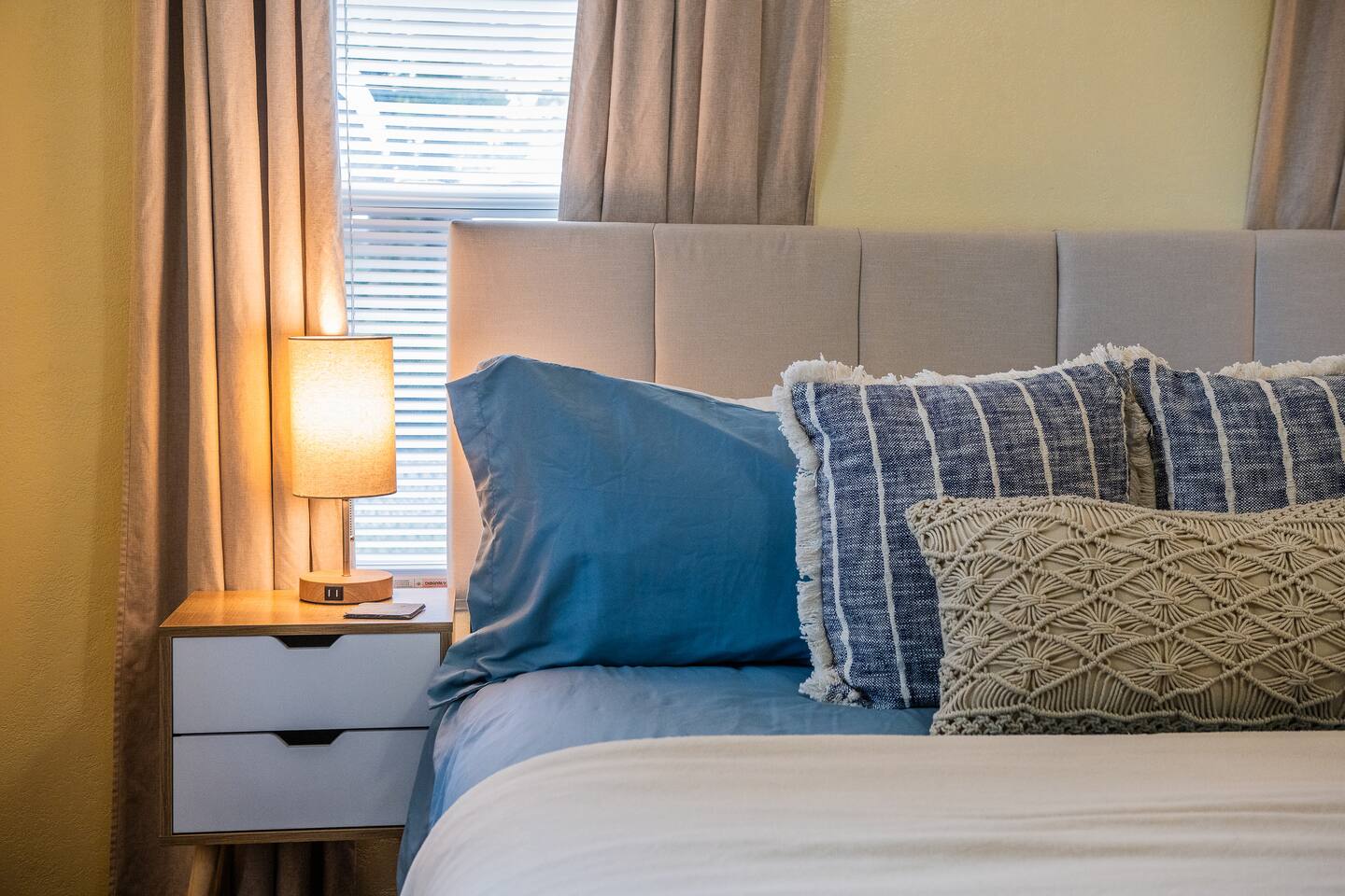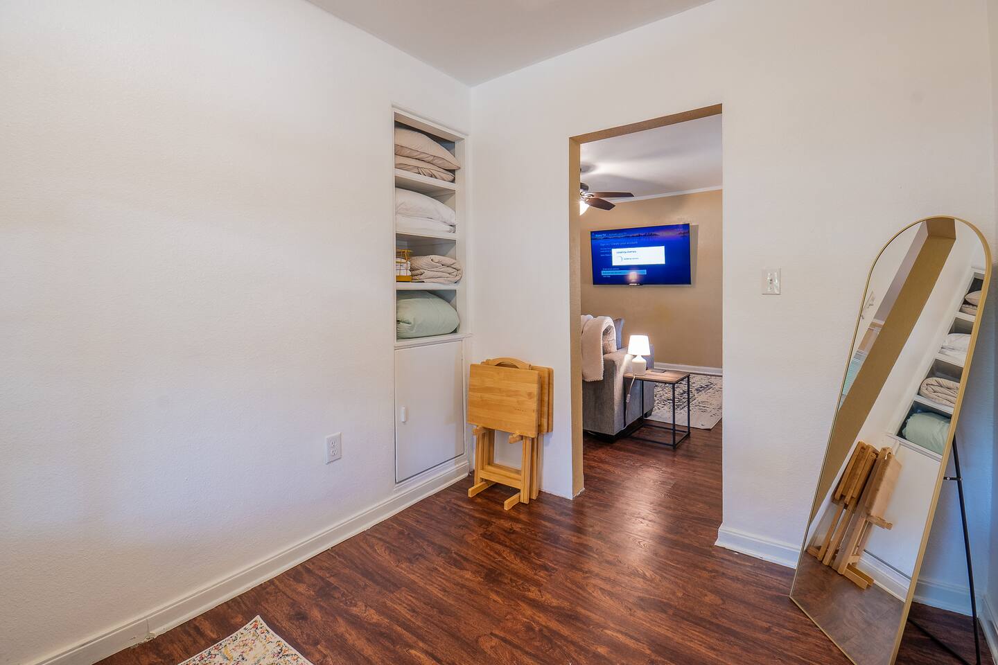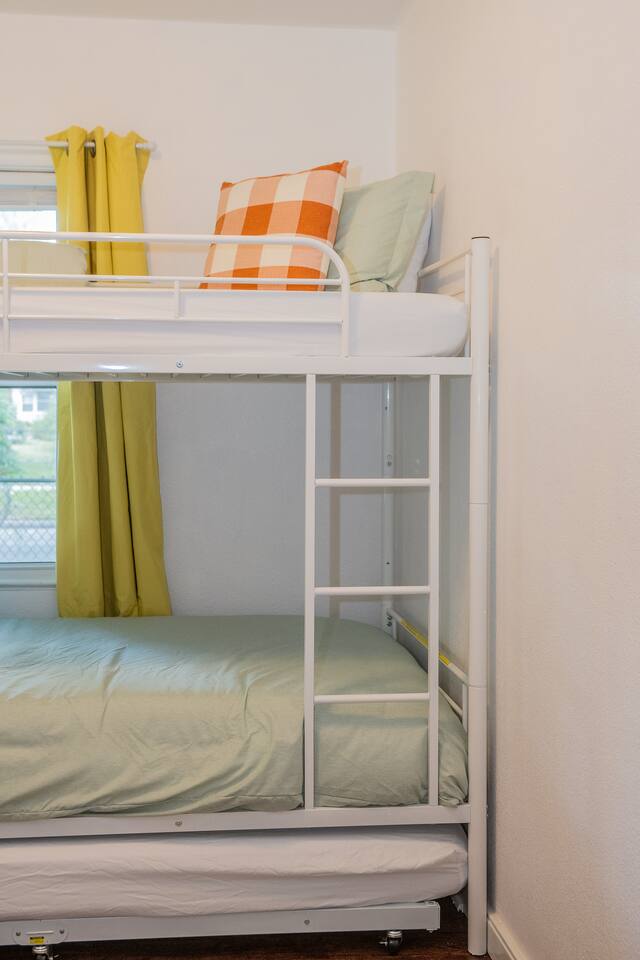 √ Bedroom One The centerpiece of the modern themed bedroom is a lavish, king sized bed adorned with crisp linens that promise a restful night's sleep. It has two large closets, plenty of storage space for extended stays. It has black-out curtains, which make it great for sleeping in. Smart TV. √ Bedroom Two: This adorable bedroom has twin size bunk beds with an additional twin trundle. Lots of extra pillows and blankets. Black out curtains for restful sleep. (This room currently does not have a door on it, it was a converted office. We have curtain hung and we hope to have a door soon.) √ Full Bathroom: Guest bath is complete with a small sink and a shower. We provide shampoo, conditioner, and body wash as well as plenty of towels. √ Living Room: Cozy space with lots of natural lighting. Queen Size memory foam sleeper sofa as as well as a big screen Smart TV. √ Kitchen: The kitchen is a culinary haven, equipped with everything you need to unleash your inner chef. Whether you're whipping up a meal from scratch or reheating leftovers, you'll find all the tools you need. For coffee enthusiasts, you’ll find a Keurig and a drip coffee maker with coffee, sugar and creamer. √ Extras: - Dining room table for 3 with additional dinner trays - Small library full of books - Washer and dryer (supplies included) - Pet friendly with Paid Pet Fee