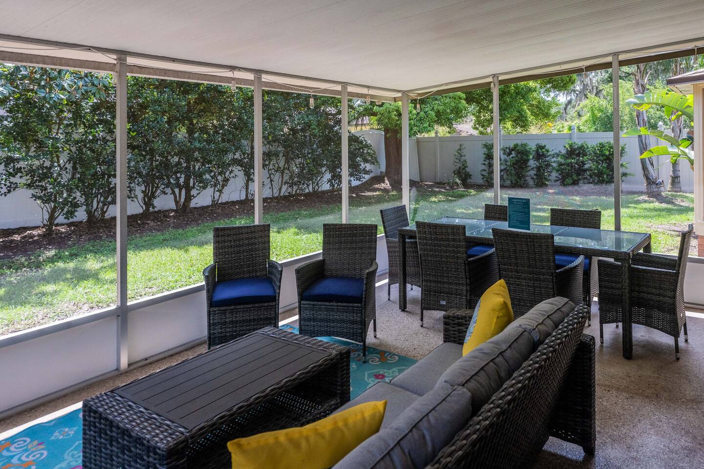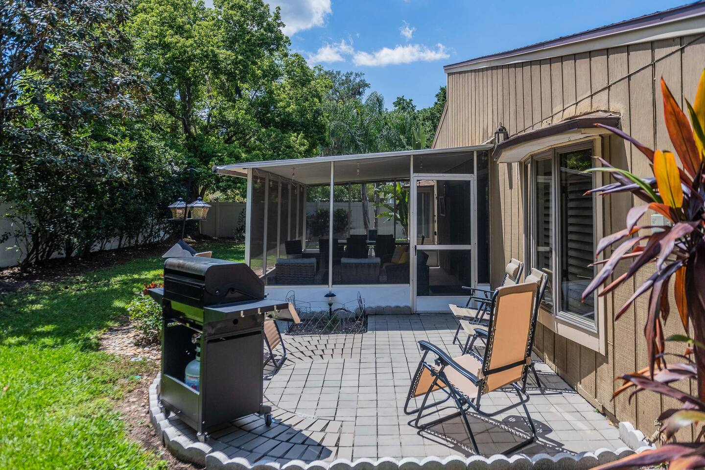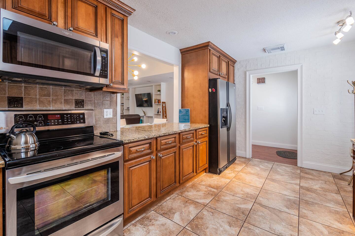 √ Bedroom One: The centerpiece of the modern themed bedroom is a lavish, king sized bed with a comfy mattress and linens that promise a restful night's sleep. It has a large closet & plenty of storage space for extended stays. Gorgeous bay windows bring in beautiful natural sunlight. Dedicated desk for remote professionals. This room has a Smart TV. √ Ensuite Master Bath: Cute Bathroom with a walk in shower. Shampoo, conditioner, body wash provided. Hair dryer, curling iron and straightener available for use. Plenty of towels. √ Bedroom Two: This stylish bedroom comes with a queen sized bed with a comfy mattress and linens. It has a large closet and storage space for extended stays. Gorgeous bay windows bring in beautiful natural sunlight. Futon Couch. √ Bedroom Three: This stylish bedroom comes with a queen sized bed with a comfy mattress and linens. It has a large closet and storage space for extended stays. Beautifully painted wall mural. √ Bedroom Four: Newly added, pictures coming soon! Small bedroom with a full size bed √ Guest Full Bathroom: Cute Bathroom with a tub/shower combo. Shampoo, conditioner, body wash and a hair dryer available for use. Plenty of towels available. √ Living Room: Curl up on the couched and enjoy your favorite show or movie on the smart TV. This living room comfortably seats 6 people. The living room offers gorgeous views out the back yard. Vaulted ceilings and large entertainment shelves full of books and games for all ages! √ Kitchen: The kitchen is a culinary haven, equipped with everything you need to unleash your inner chef. Whether you're whipping up a meal from scratch or reheating leftovers, you'll find all the tools you need. For coffee enthusiasts, you’ll find a Keurig and a drip coffee maker with a variety of coffees, creamers as well as tea options. √ Dining: The indoor dining room table has seating for 6. The outdoor patio table also seat 6. √ Extras: - Screened in patio - Multiple outdoor seating areas - Grill - Washer and dryer (supplies included) - Pet friendly with paid pet fee!