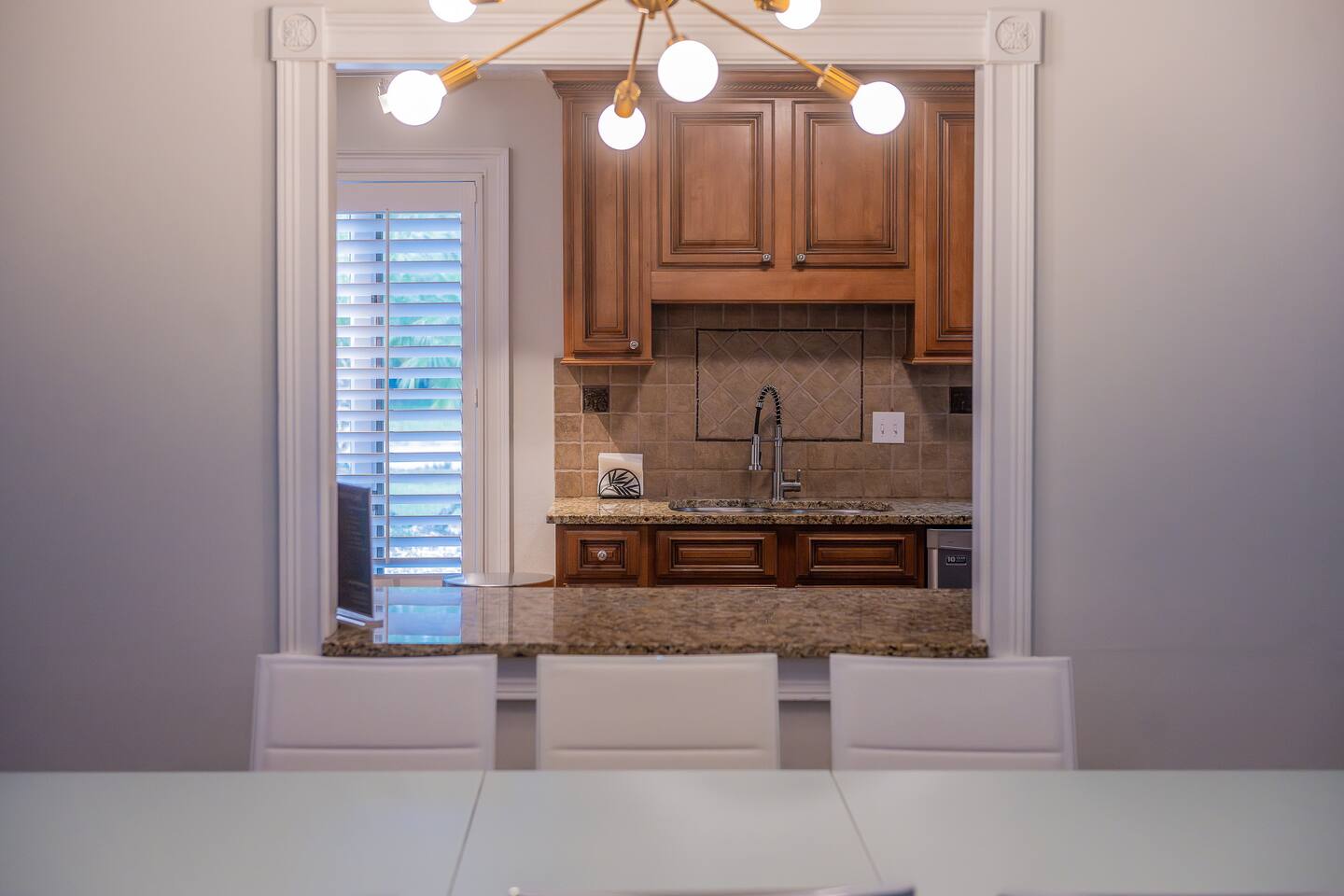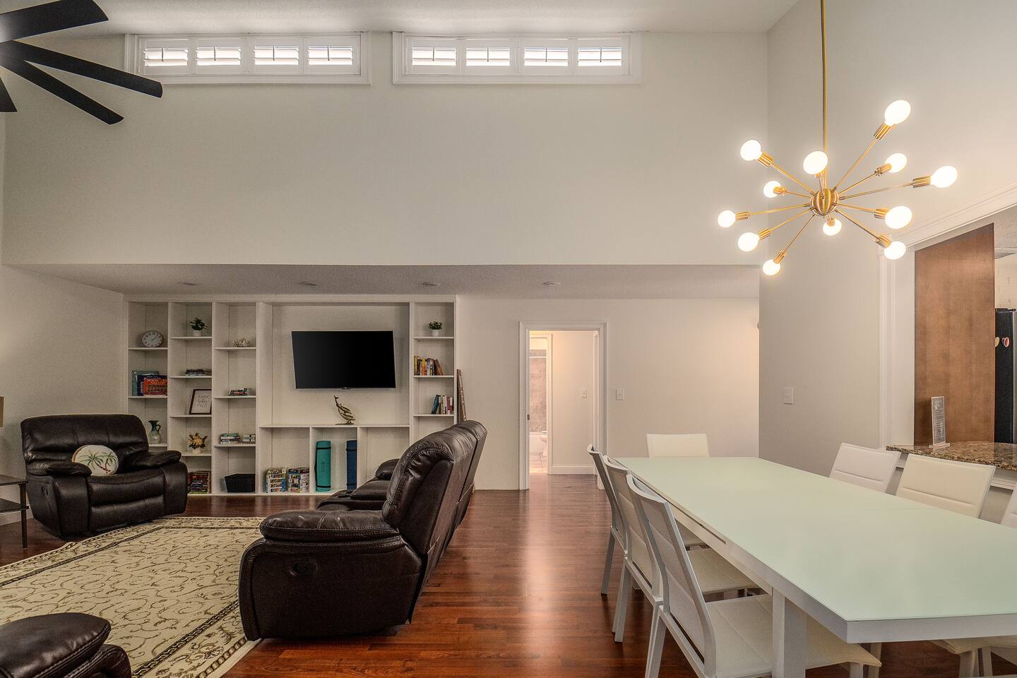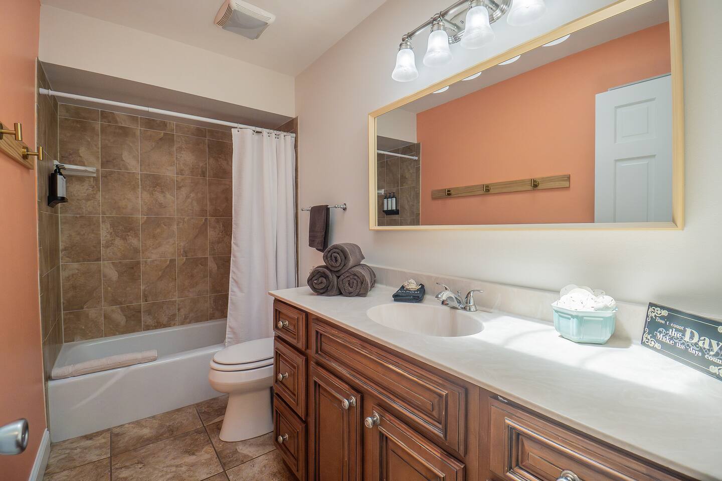 √ Bedroom One: The centerpiece of the modern themed bedroom is a lavish, king sized bed with a comfy mattress and linens that promise a restful night's sleep. It has a large closet & plenty of storage space for extended stays. Gorgeous bay windows bring in beautiful natural sunlight. Dedicated desk for remote professionals. This room has a Smart TV. √ Ensuite Master Bath: Cute Bathroom with a walk in shower. Shampoo, conditioner, body wash provided. Hair dryer, curling iron and straightener available for use. Plenty of towels. √ Bedroom Two: This stylish bedroom comes with a queen sized bed with a comfy mattress and linens. It has a large closet and storage space for extended stays. Gorgeous bay windows bring in beautiful natural sunlight. Futon Couch. √ Bedroom Three: This stylish bedroom comes with a queen sized bed with a comfy mattress and linens. It has a large closet and storage space for extended stays. Beautifully painted wall mural. √ Bedroom Four: Newly added, pictures coming soon! Small bedroom with a full size bed √ Guest Full Bathroom: Cute Bathroom with a tub/shower combo. Shampoo, conditioner, body wash and a hair dryer available for use. Plenty of towels available. √ Living Room: Curl up on the couched and enjoy your favorite show or movie on the smart TV. This living room comfortably seats 6 people. The living room offers gorgeous views out the back yard. Vaulted ceilings and large entertainment shelves full of books and games for all ages! √ Kitchen: The kitchen is a culinary haven, equipped with everything you need to unleash your inner chef. Whether you're whipping up a meal from scratch or reheating leftovers, you'll find all the tools you need. For coffee enthusiasts, you’ll find a Keurig and a drip coffee maker with a variety of coffees, creamers as well as tea options. √ Dining: The indoor dining room table has seating for 6. The outdoor patio table also seat 6. √ Extras: - Screened in patio - Multiple outdoor seating areas - Grill - Washer and dryer (supplies included) - Pet friendly with paid pet fee!