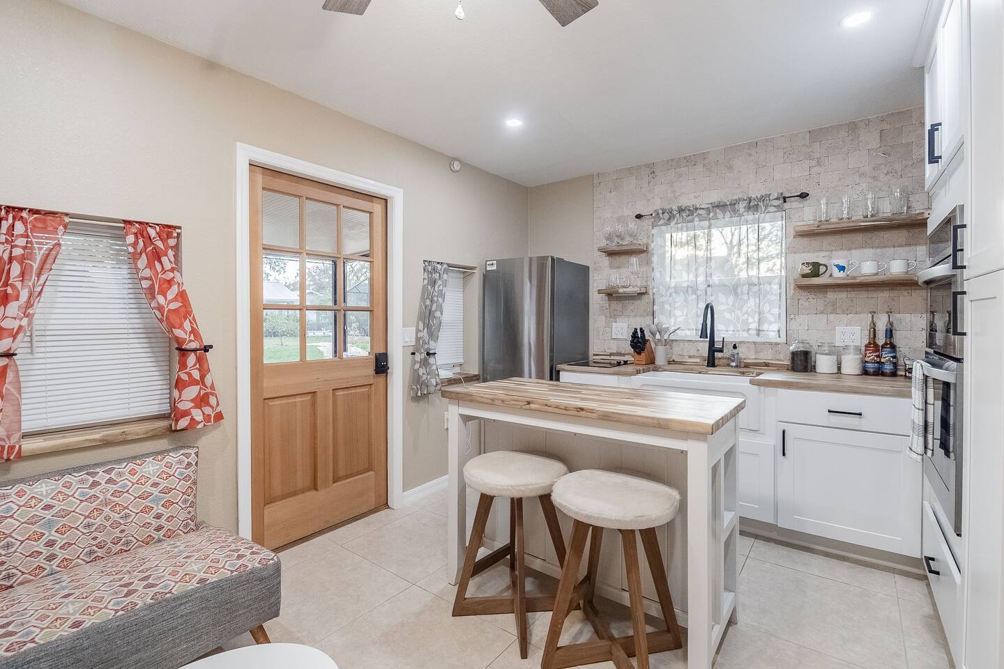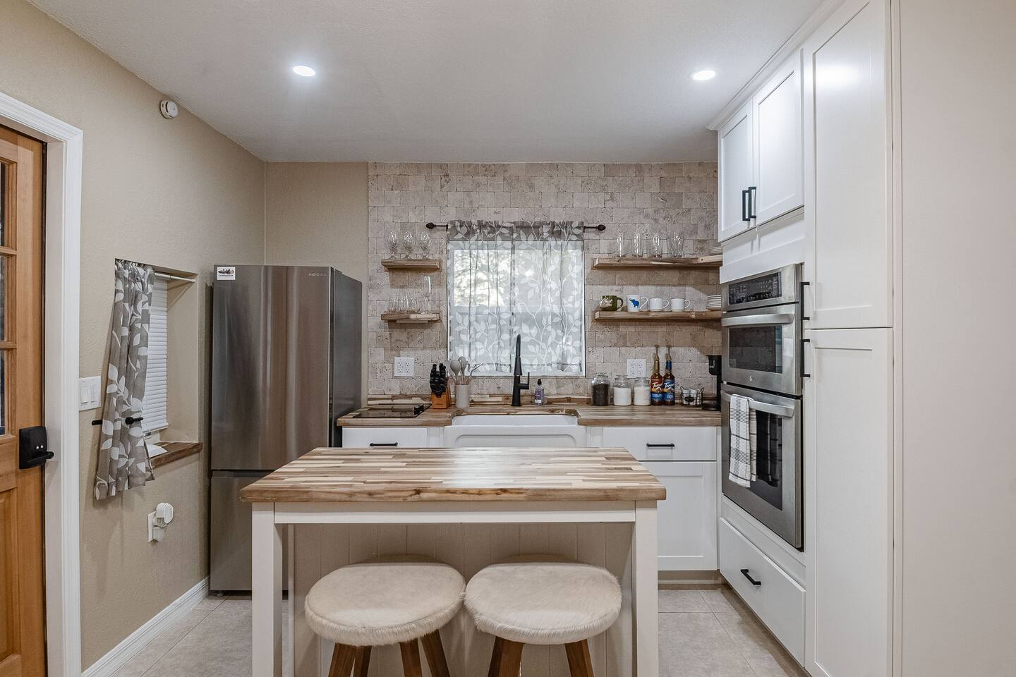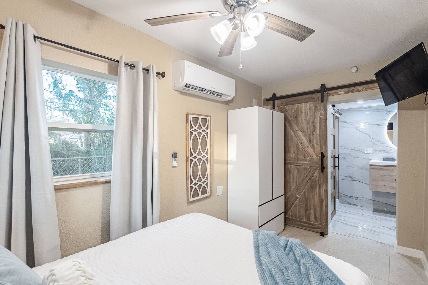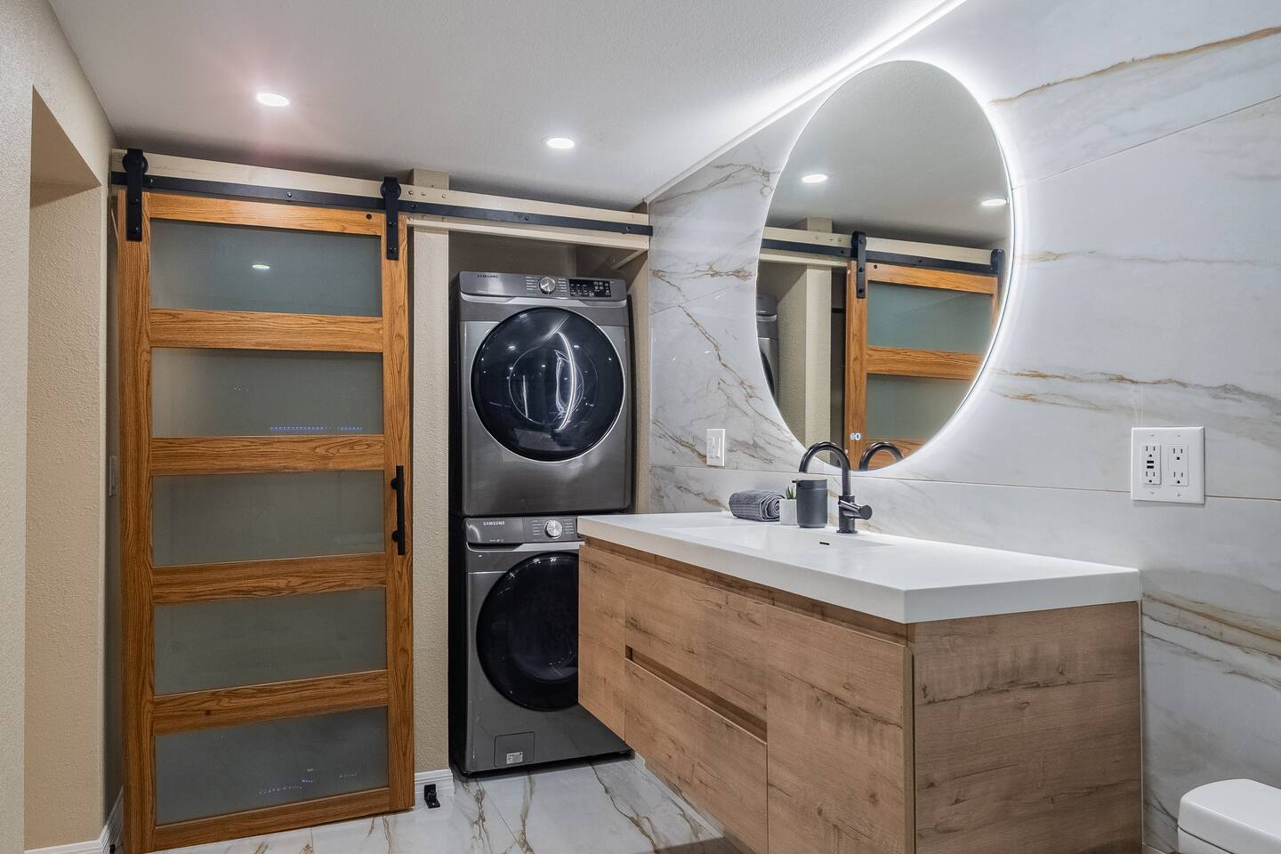 This stylish guest house blends modern luxury with cozy comfort. The bathroom finished with marble walls, a backlit round mirror, walk-in shower, and soaking tub for a spa-like feel. A hidden laundry nook with sliding barn doors. The bedroom is inviting with soft linens and natural light. The kitchen features butcher block counters, open shelving, and a farmhouse sink, opening to a cozy living area with seating and mounted TV. Perfect for a relaxing stay!