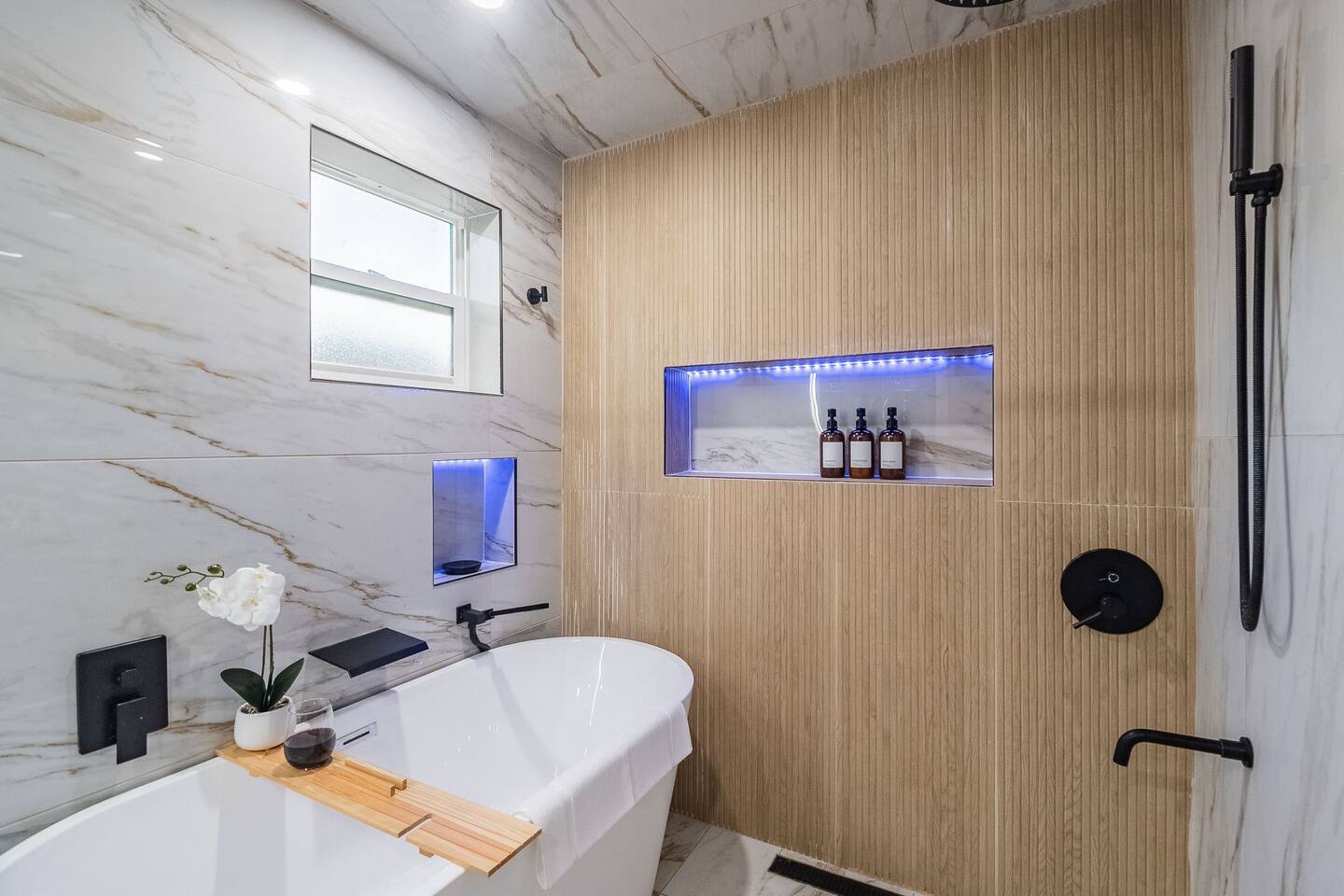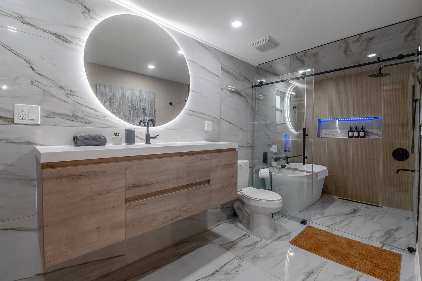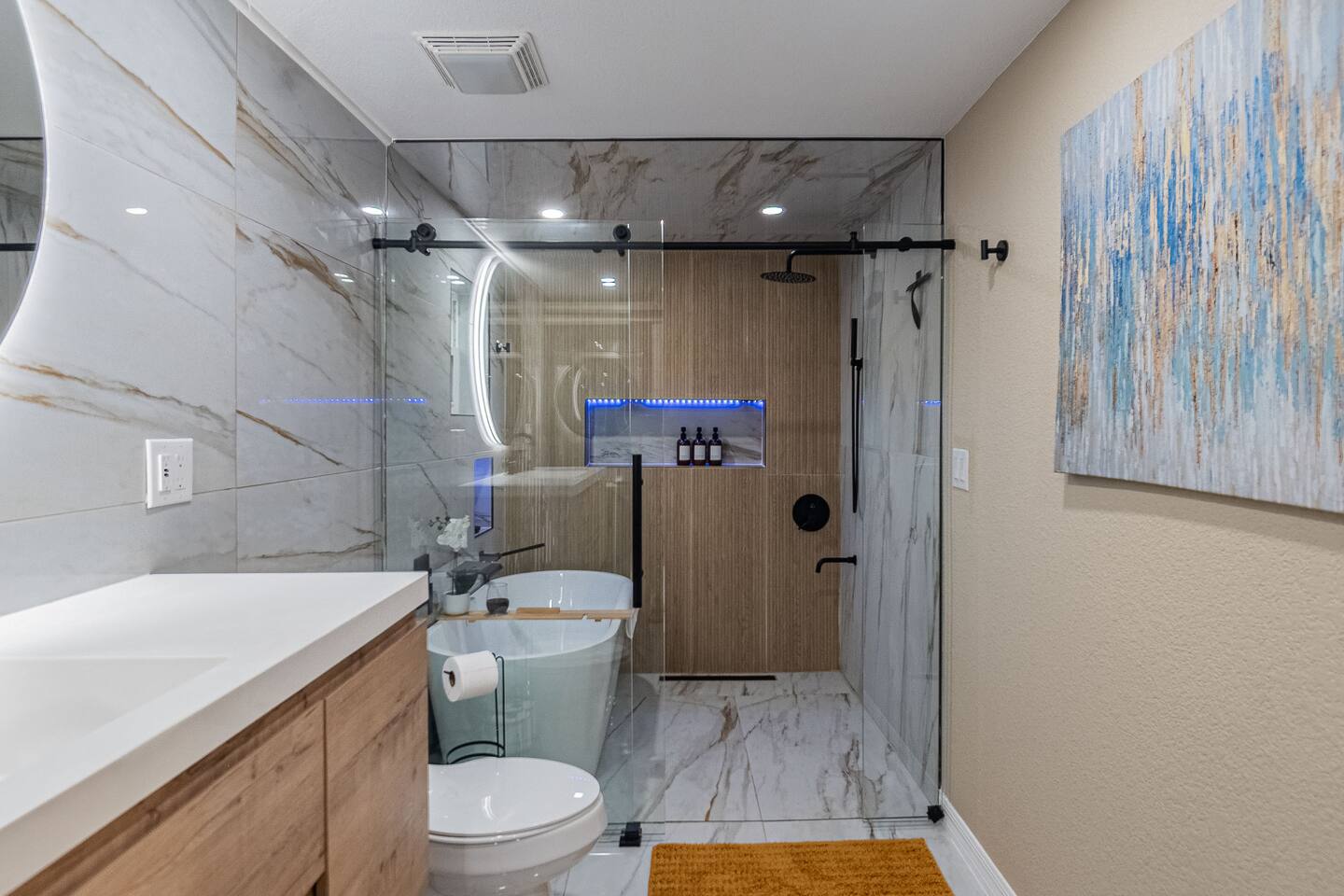 This stylish guest house blends modern luxury with cozy comfort. The bathroom finished with marble walls, a backlit round mirror, walk-in shower, and soaking tub for a spa-like feel. A hidden laundry nook with sliding barn doors. The bedroom is inviting with soft linens and natural light. The kitchen features butcher block counters, open shelving, and a farmhouse sink, opening to a cozy living area with seating and mounted TV. Perfect for a relaxing stay!