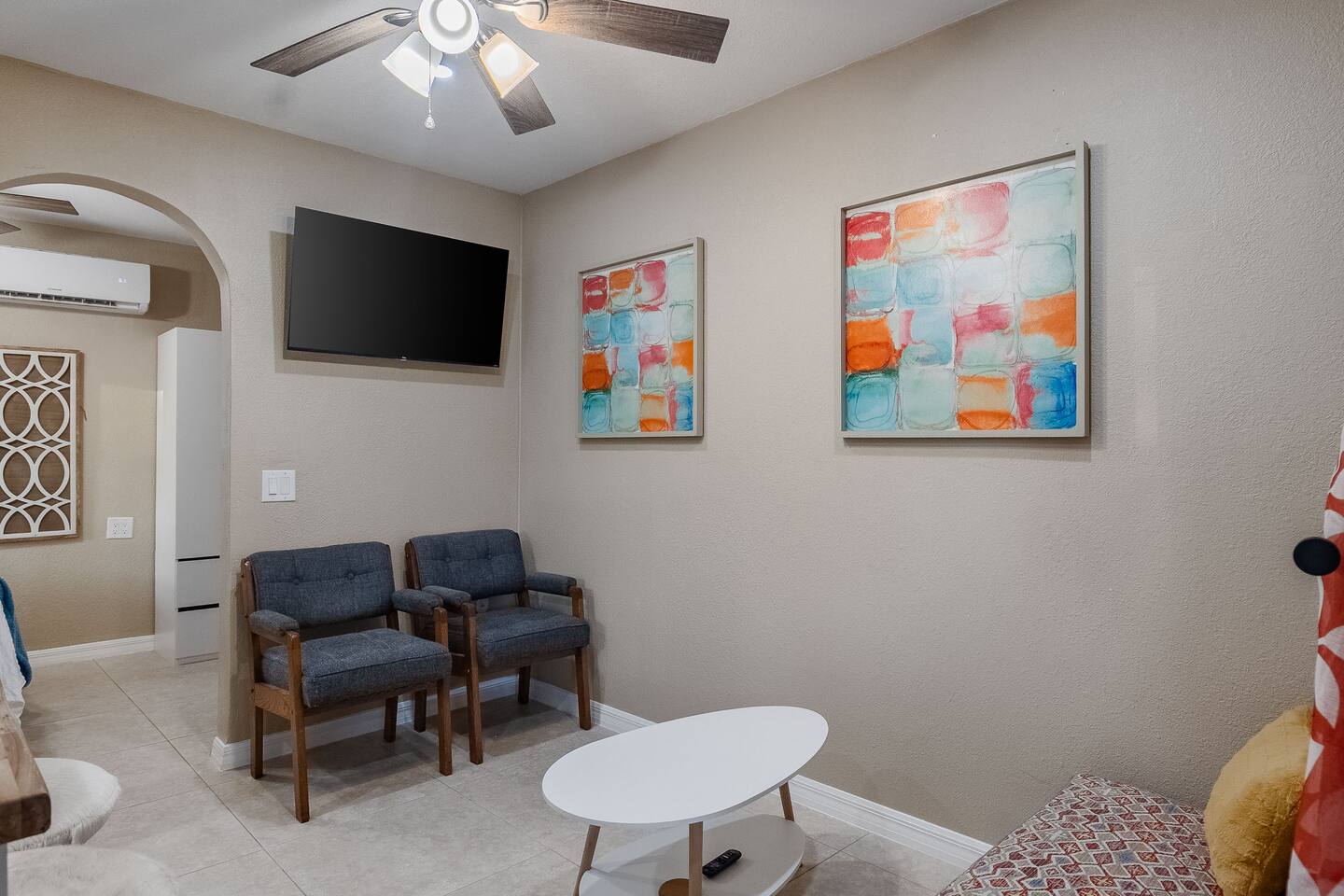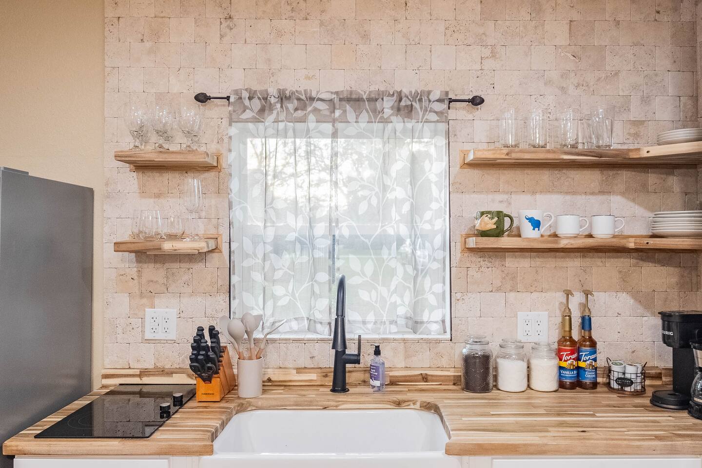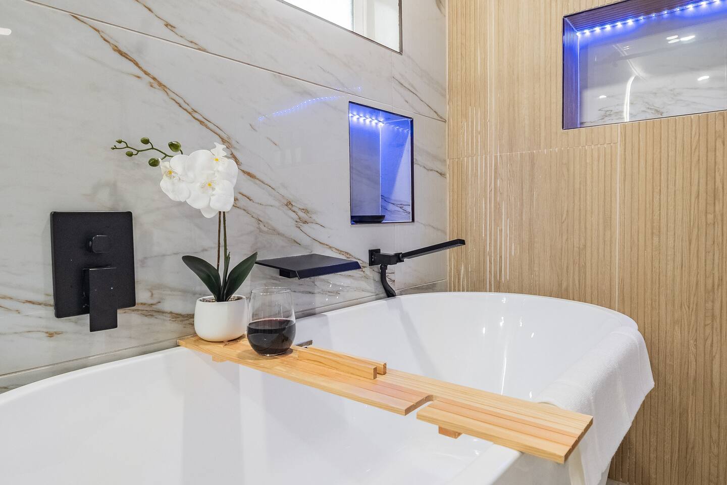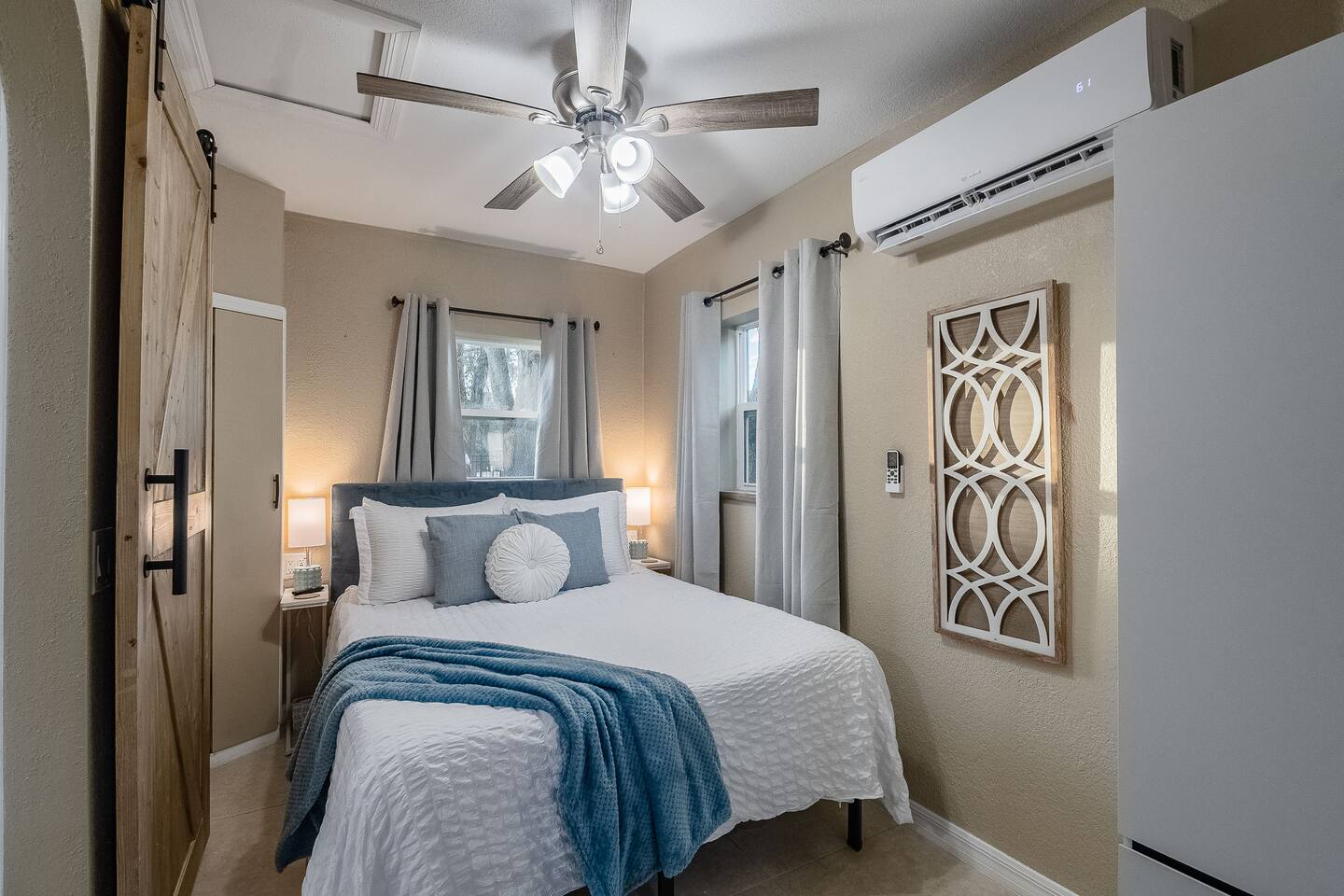 This stylish guest house blends modern luxury with cozy comfort. The bathroom finished with marble walls, a backlit round mirror, walk-in shower, and soaking tub for a spa-like feel. A hidden laundry nook with sliding barn doors. The bedroom is inviting with soft linens and natural light. The kitchen features butcher block counters, open shelving, and a farmhouse sink, opening to a cozy living area with seating and mounted TV. Perfect for a relaxing stay!