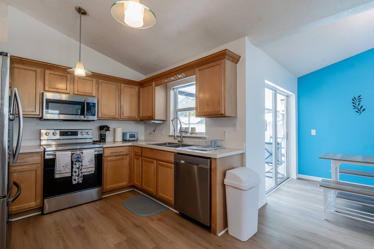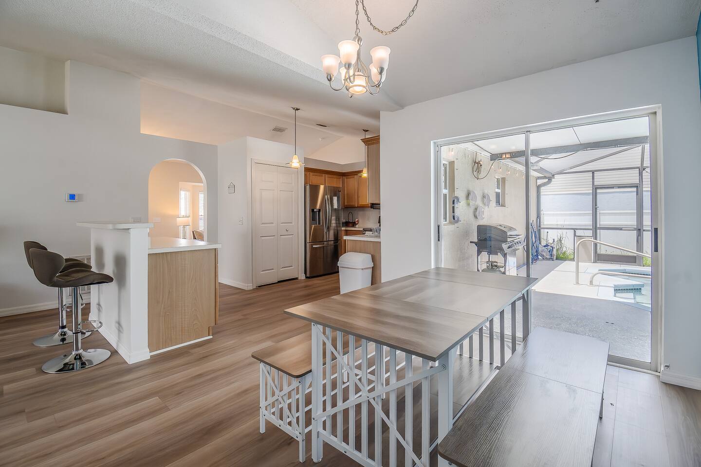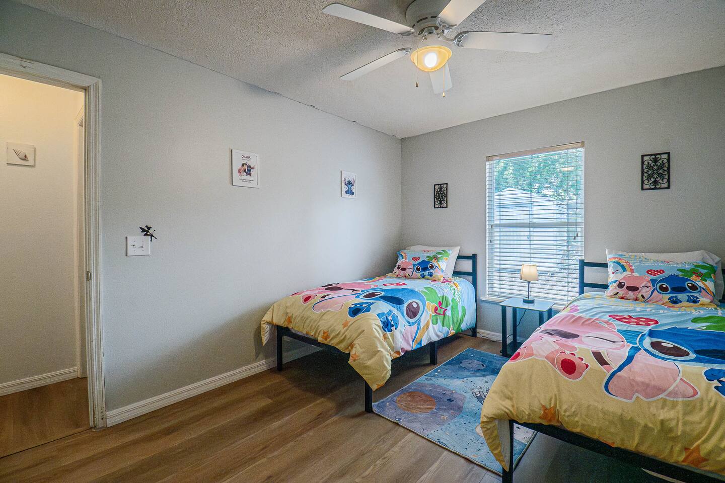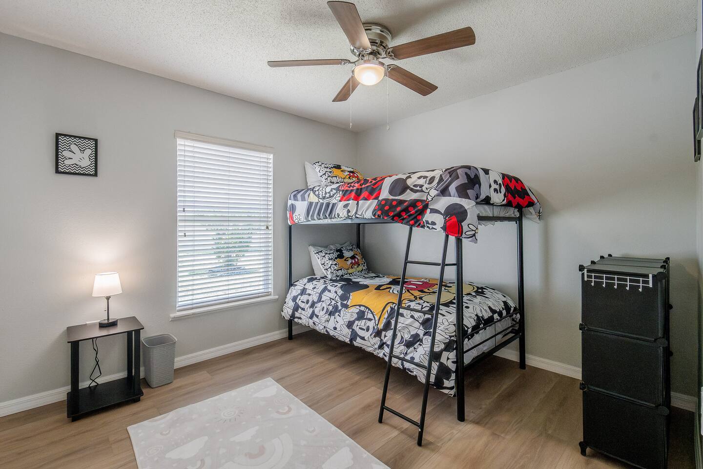 √ Bedroom One - The centerpiece of the modern themed bedroom is a lavish, king sized bed with a comfy mattress and linens that promise a restful night's sleep. It has a large closet, plenty of storage space for extended stays. It has black-out curtains, which make it great for sleeping in. Smart TV √ Ensuite Master Full Bathroom - Located in the Main Bedroom. Shower / Tub Combo. Shampoo, conditioner, body wash and a hair dryer available for use. Plenty of towels available. √ Bedroom Two - This stylish bedroom comes with a queen sized bed with a comfy mattress and linens. It has a large closet and storage space for extended stays. √ Bedroom Three - The Mickey and Minnie room has twin size bunk beds! √ Bedroom Four - The Lilo and Stitch room has two separate twin beds. √ Full Guest Bathroom: Cute Bathroom with a tub/shower combo. Shampoo, conditioner, body wash and a hair dryer available for use. Plenty of towels available. √ Living Room: Curl up on the couch and enjoy your favorite show or movie on the screen smart TV. This living room comfortably seats 4 people. √ Family Room: Don't want to watch the same movie? The front family room has a futon couch and a Smart TV! √ Kitchen: The kitchen is a culinary haven, equipped with everything you need to unleash your inner chef. Whether you're whipping up a meal from scratch or reheating leftovers, you'll find all the tools you need. For coffee enthusiasts, you’ll find a coffee machine with a variety of coffees, and creamers. √ Dining Space: We have a picnic style table that can seat 4-6 with two additional seats at the island bar. √ Pool and Patio: Screened in patio and pool area for the hot summer days! The pool is not heated, but warms up very quickly in the summer time. The patio has a built in misting system you can turn on to cool down even if you are not going for a swim. The outdoor patio table sits 4 people. Propane grill available for use as well. √ Extras: - Boat ramp for Lake Sears at the front of our community! Bring your water toys! - Driveway can fit 2-3 vehicles, street parking is available just don't block other driveways. - Washer and Dryer (supplies included)