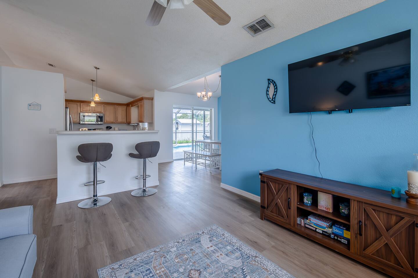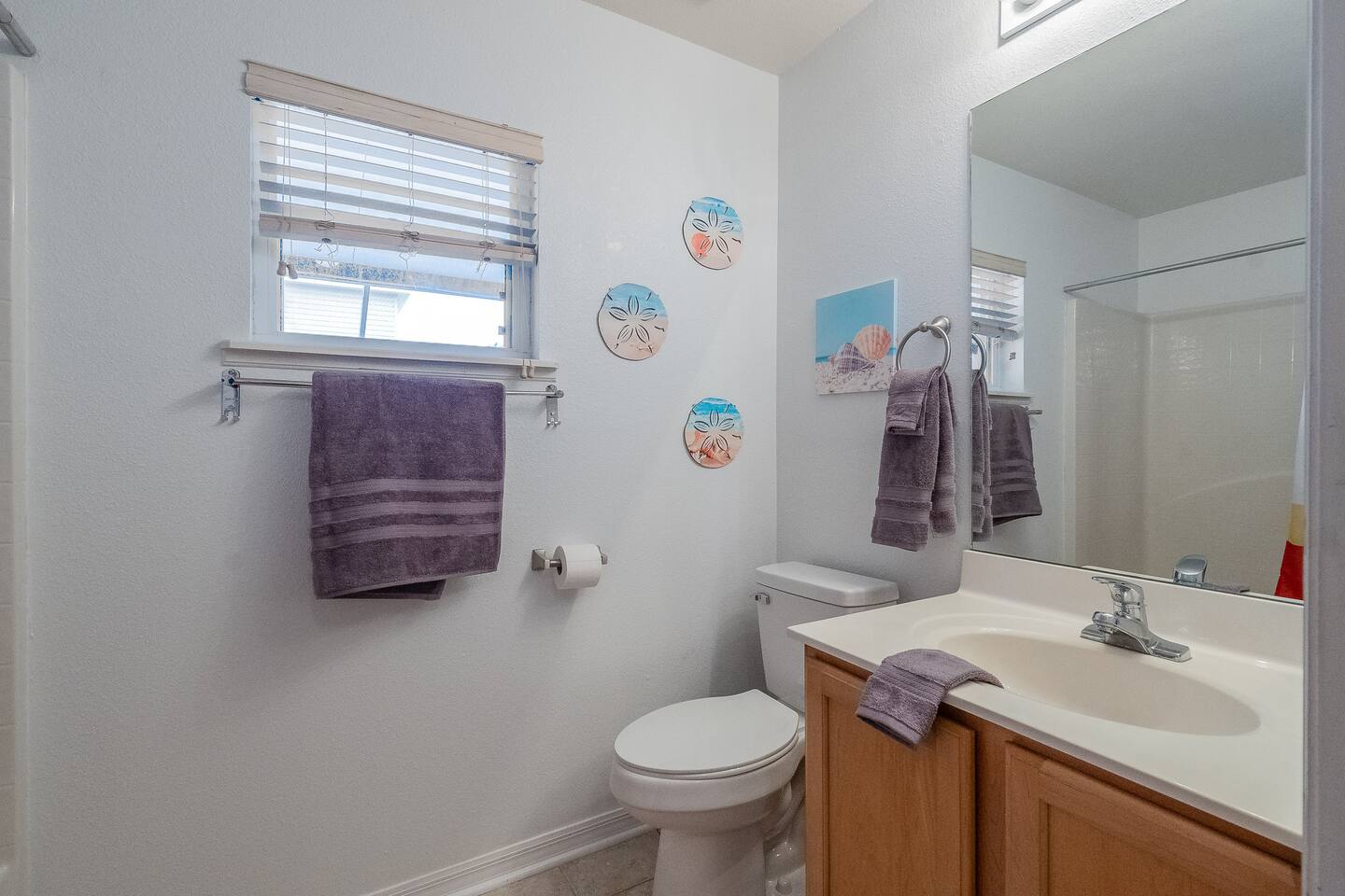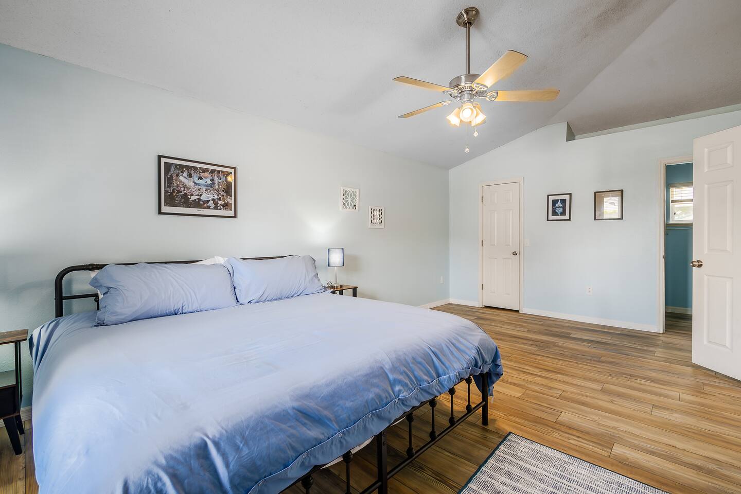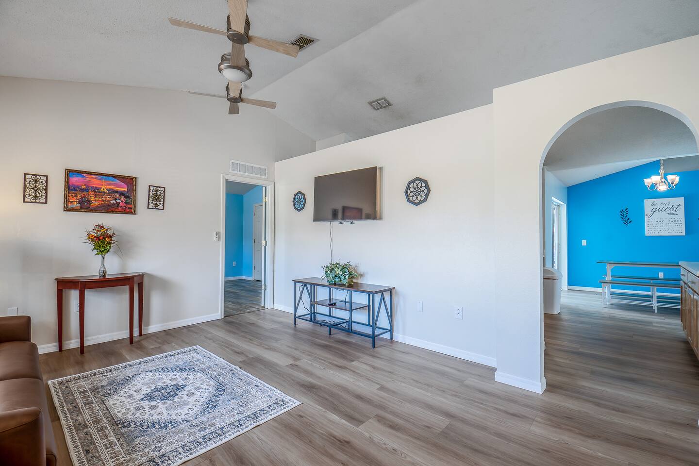 √ Bedroom One - The centerpiece of the modern themed bedroom is a lavish, king sized bed with a comfy mattress and linens that promise a restful night's sleep. It has a large closet, plenty of storage space for extended stays. It has black-out curtains, which make it great for sleeping in. Smart TV √ Ensuite Master Full Bathroom - Located in the Main Bedroom. Shower / Tub Combo. Shampoo, conditioner, body wash and a hair dryer available for use. Plenty of towels available. √ Bedroom Two - This stylish bedroom comes with a queen sized bed with a comfy mattress and linens. It has a large closet and storage space for extended stays. √ Bedroom Three - The Mickey and Minnie room has twin size bunk beds! √ Bedroom Four - The Lilo and Stitch room has two separate twin beds. √ Full Guest Bathroom: Cute Bathroom with a tub/shower combo. Shampoo, conditioner, body wash and a hair dryer available for use. Plenty of towels available. √ Living Room: Curl up on the couch and enjoy your favorite show or movie on the screen smart TV. This living room comfortably seats 4 people. √ Family Room: Don't want to watch the same movie? The front family room has a futon couch and a Smart TV! √ Kitchen: The kitchen is a culinary haven, equipped with everything you need to unleash your inner chef. Whether you're whipping up a meal from scratch or reheating leftovers, you'll find all the tools you need. For coffee enthusiasts, you’ll find a coffee machine with a variety of coffees, and creamers. √ Dining Space: We have a picnic style table that can seat 4-6 with two additional seats at the island bar. √ Pool and Patio: Screened in patio and pool area for the hot summer days! The pool is not heated, but warms up very quickly in the summer time. The patio has a built in misting system you can turn on to cool down even if you are not going for a swim. The outdoor patio table sits 4 people. Propane grill available for use as well. √ Extras: - Boat ramp for Lake Sears at the front of our community! Bring your water toys! - Driveway can fit 2-3 vehicles, street parking is available just don't block other driveways. - Washer and Dryer (supplies included)