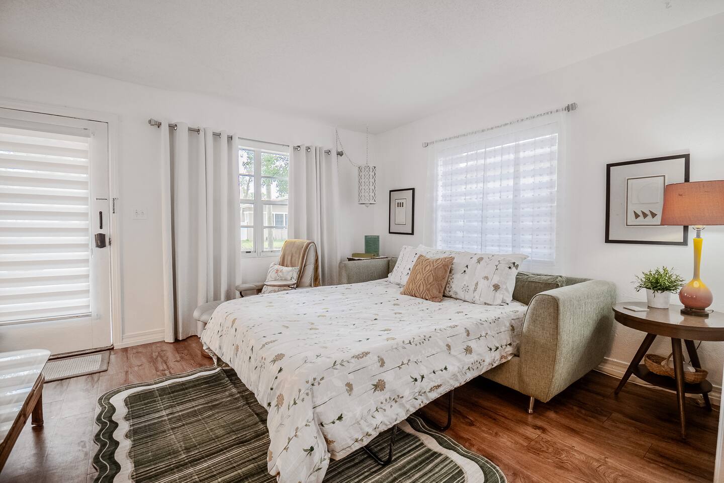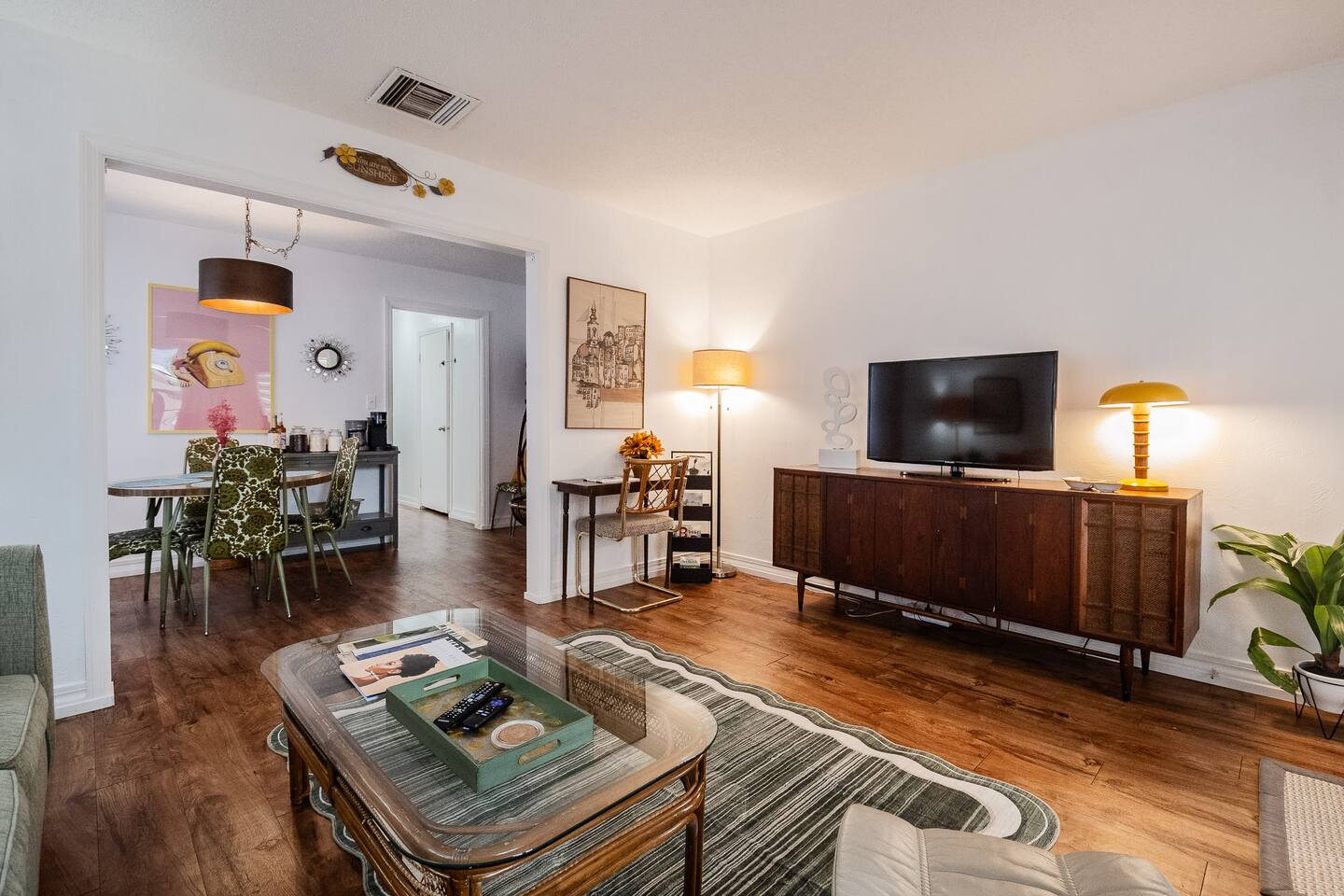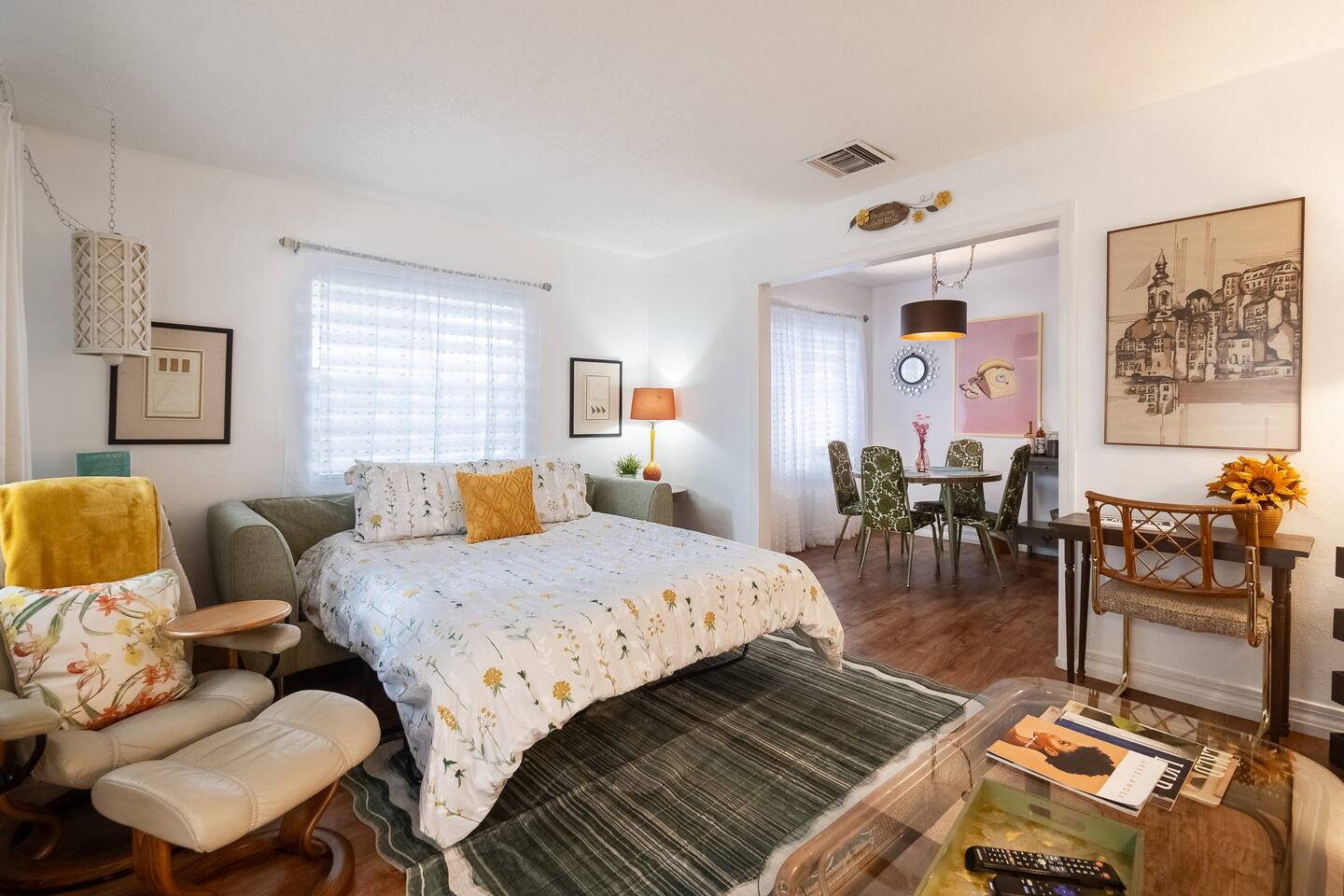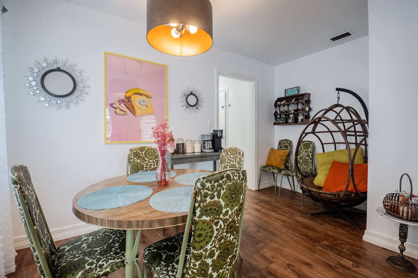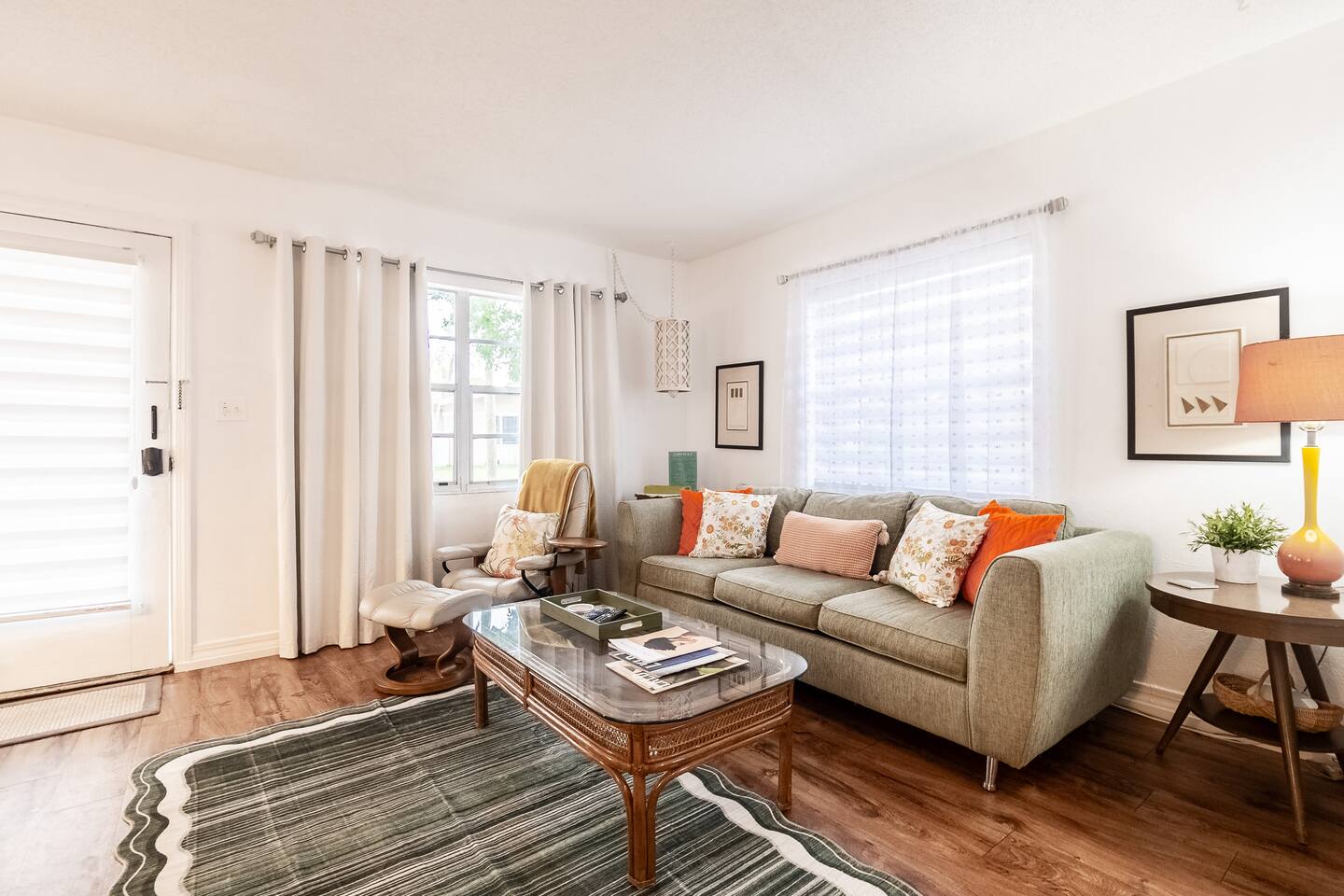 Step back in time at this 70’s-style retro retreat in Downtown Lakeland! Perfectly located and within walking distance of Florida Southern College and Lake Morton, and just minutes from Lake Hollingsworth and our vibrant Downtown. This one-bedroom gem features a queen bed, one bath, a cozy living room with a queen sleeper sofa, a fully stocked small kitchen, and a charming coffee bar. Enjoy a stylish and comfortable stay in the heart of it all!