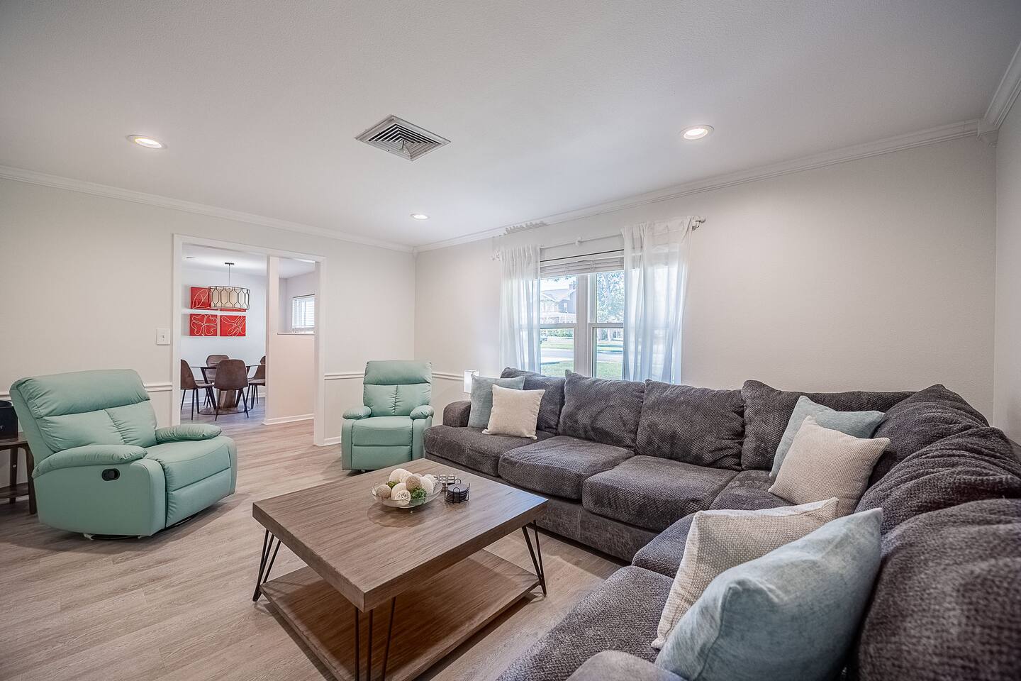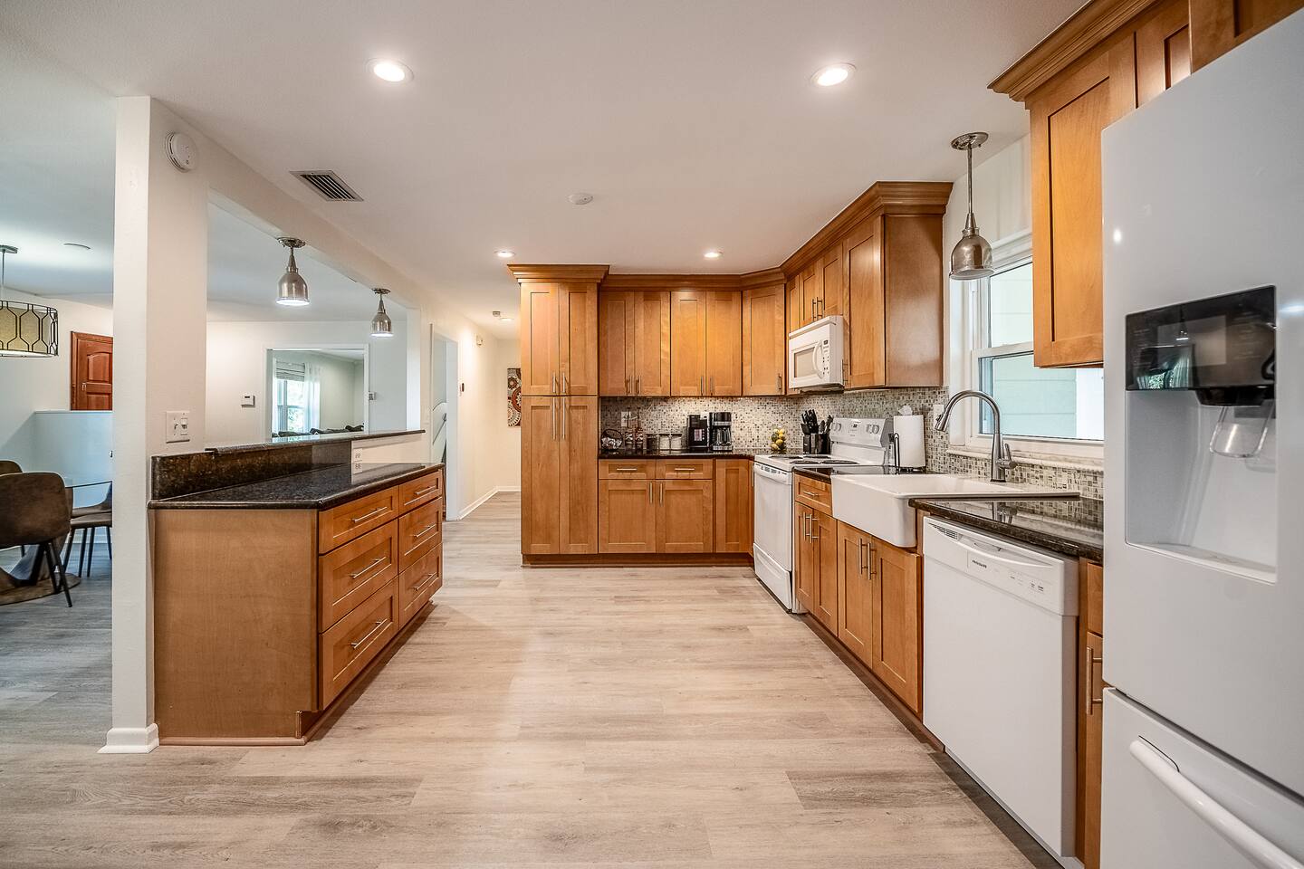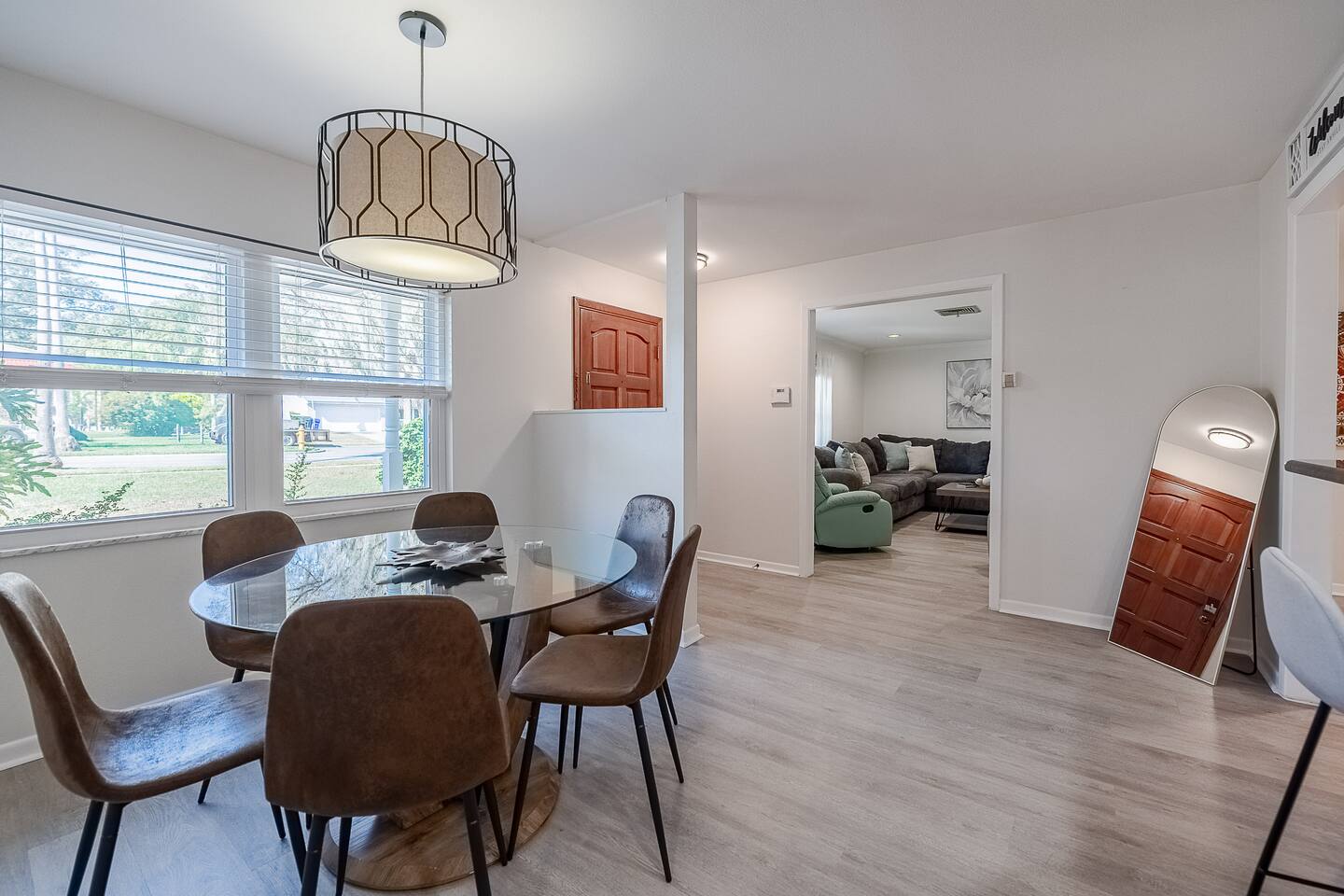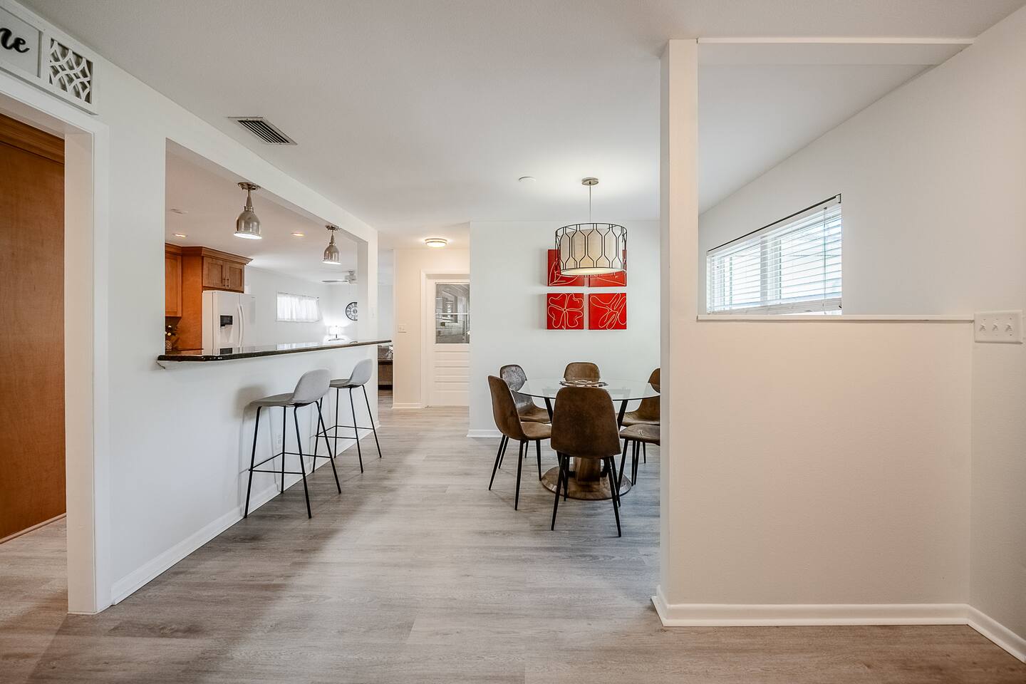 √ Location: Located in the Heart of Downtown Lakeland ! 1.9 Miles to Florida Southern College Miles to South Eastern University 3.1 Miles to Downtown Lakeland 2.2 Miles to Lake Morton 0.4 Miles to Lake Hollingsworth 3.1 Miles to RP Funding Center 4.2 Miles to Bonnet Springs Park 0.3 Miles to Cleveland Heights Golf Course √ Bedroom One - The centerpiece of the modern themed bedroom is a lavish, king sized bed with a comfy mattress and linens that promise a restful night's sleep. It has a Luggage racks and a closet, great for extended stays. It has black-out curtains, which make it great for sleeping in. Smart TV. End tables with charging stations. √ Ensuite Primary Bath - Walk in shower. Plenty of towels, shampoo conditioner and body wash, and a hair dryer. Access to the outdoor patio space, √ Bedroom Two and Three : Both of these Bedrooms have Queen Beds, closets, luggage racks, smart TV's and end tables with charging stations. √ Guest Bath - Shower and Bathtub Combo. Plenty of towels, shampoo conditioner and body wash, and a hair dryer. √ Living Room: Curl up on the oversized couch with two additional recliners and enjoy your favorite show or movie on the large screen smart TV. This living room comfortably seats 8 people. √ Living Room Two: Queen Size Sleeper Sofa, Smart TV and designated workstation. This room is not completely private but it's great for those 2 extra guests or large families. √ Kitchen: The kitchen is a culinary haven, equipped with everything you need to unleash your inner chef. Whether you're whipping up a meal from scratch or reheating leftovers, you'll find all the tools you need. For coffee enthusiasts, you’ll find a Keurig and Drip Coffee Maker with a variety of coffees, cream, syrup & sugar. √ Extras: - Fenced in Backyard with Private Patio - Two Car Garage + 2-3 spaces for parking in the driveway. - Bar Seating for 2 - Dining Table for 6 - Washer and dryer (supplies included)