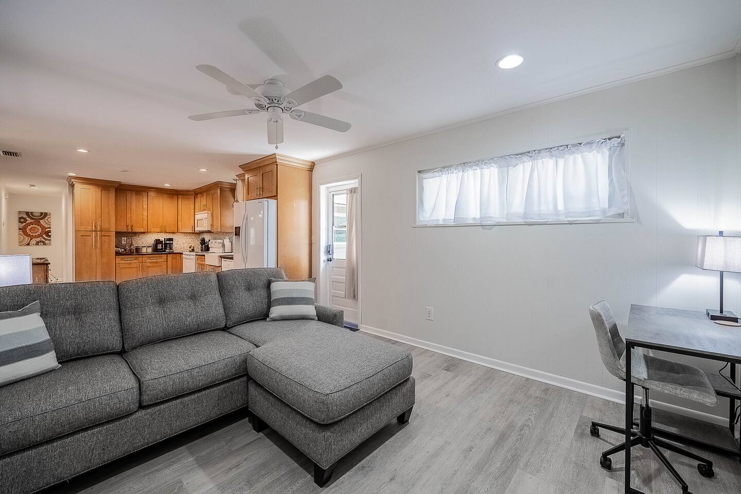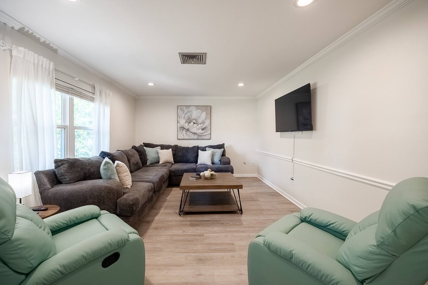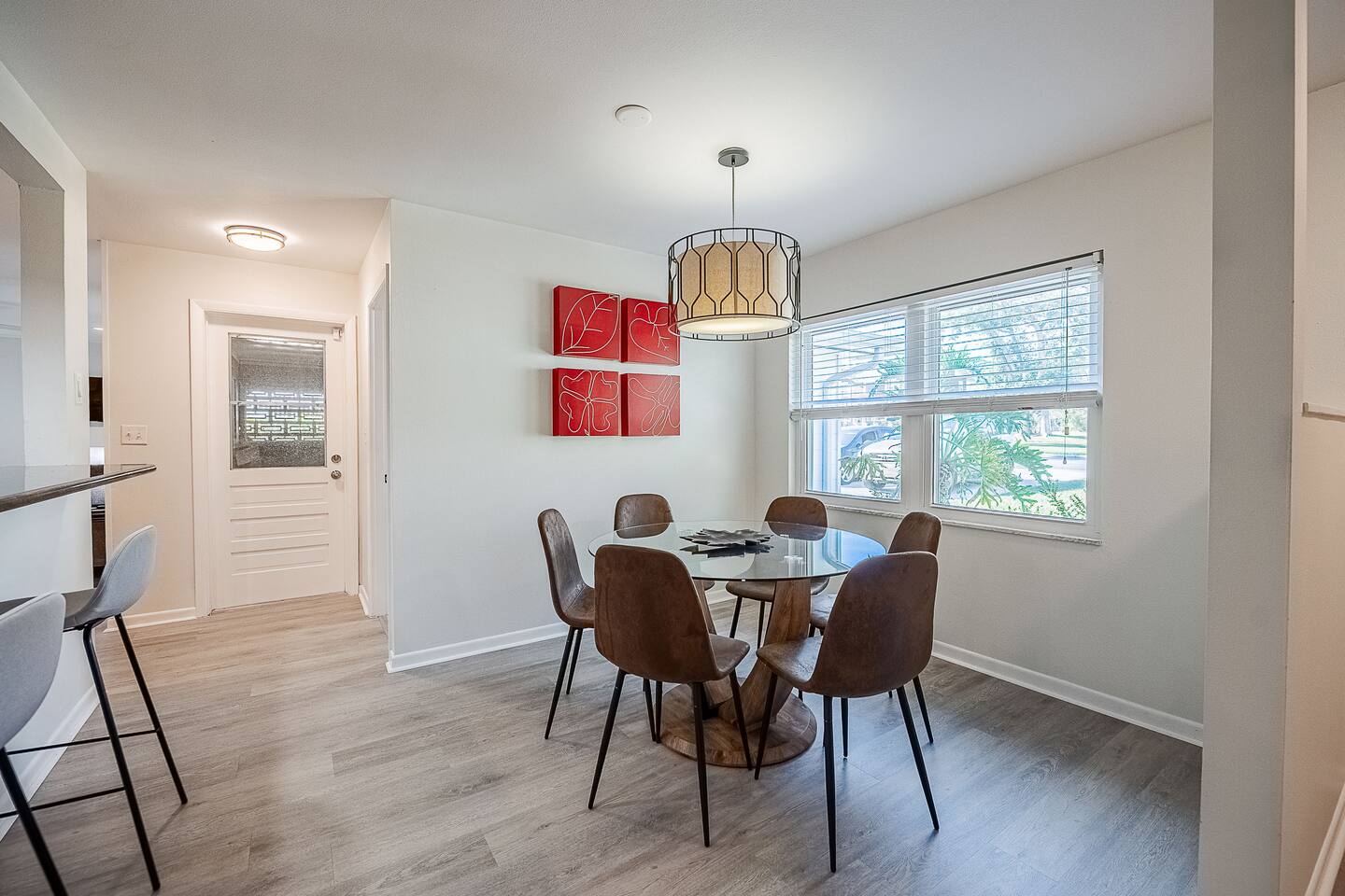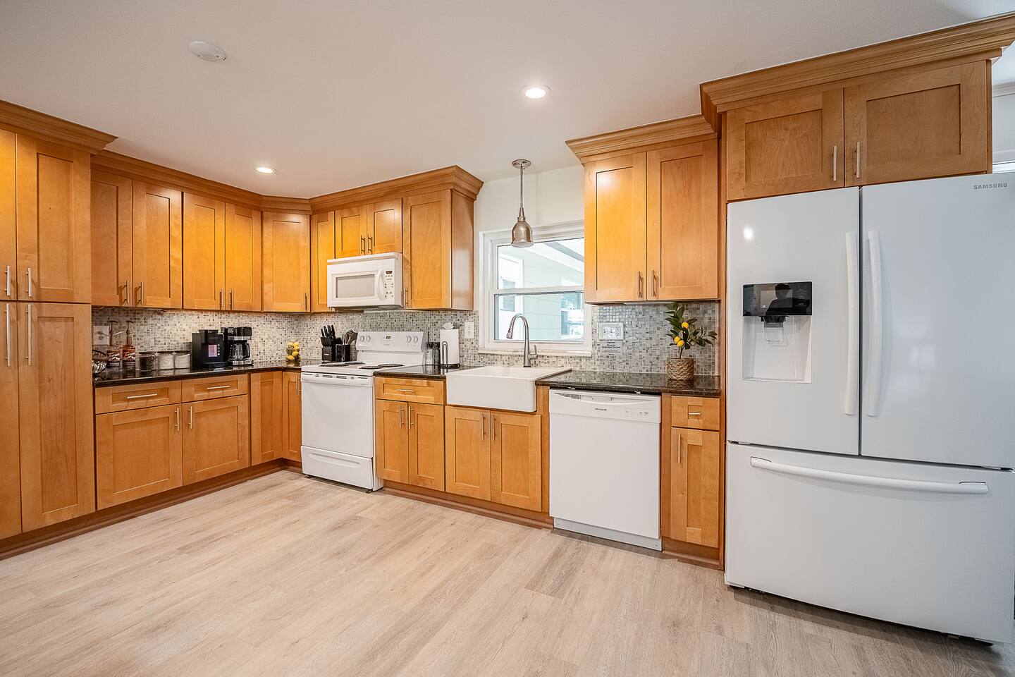 √ Location: Located in the Heart of Downtown Lakeland ! 1.9 Miles to Florida Southern College Miles to South Eastern University 3.1 Miles to Downtown Lakeland 2.2 Miles to Lake Morton 0.4 Miles to Lake Hollingsworth 3.1 Miles to RP Funding Center 4.2 Miles to Bonnet Springs Park 0.3 Miles to Cleveland Heights Golf Course √ Bedroom One - The centerpiece of the modern themed bedroom is a lavish, king sized bed with a comfy mattress and linens that promise a restful night's sleep. It has a Luggage racks and a closet, great for extended stays. It has black-out curtains, which make it great for sleeping in. Smart TV. End tables with charging stations. √ Ensuite Primary Bath - Walk in shower. Plenty of towels, shampoo conditioner and body wash, and a hair dryer. Access to the outdoor patio space, √ Bedroom Two and Three : Both of these Bedrooms have Queen Beds, closets, luggage racks, smart TV's and end tables with charging stations. √ Guest Bath - Shower and Bathtub Combo. Plenty of towels, shampoo conditioner and body wash, and a hair dryer. √ Living Room: Curl up on the oversized couch with two additional recliners and enjoy your favorite show or movie on the large screen smart TV. This living room comfortably seats 8 people. √ Living Room Two: Queen Size Sleeper Sofa, Smart TV and designated workstation. This room is not completely private but it's great for those 2 extra guests or large families. √ Kitchen: The kitchen is a culinary haven, equipped with everything you need to unleash your inner chef. Whether you're whipping up a meal from scratch or reheating leftovers, you'll find all the tools you need. For coffee enthusiasts, you’ll find a Keurig and Drip Coffee Maker with a variety of coffees, cream, syrup & sugar. √ Extras: - Fenced in Backyard with Private Patio - Two Car Garage + 2-3 spaces for parking in the driveway. - Bar Seating for 2 - Dining Table for 6 - Washer and dryer (supplies included)