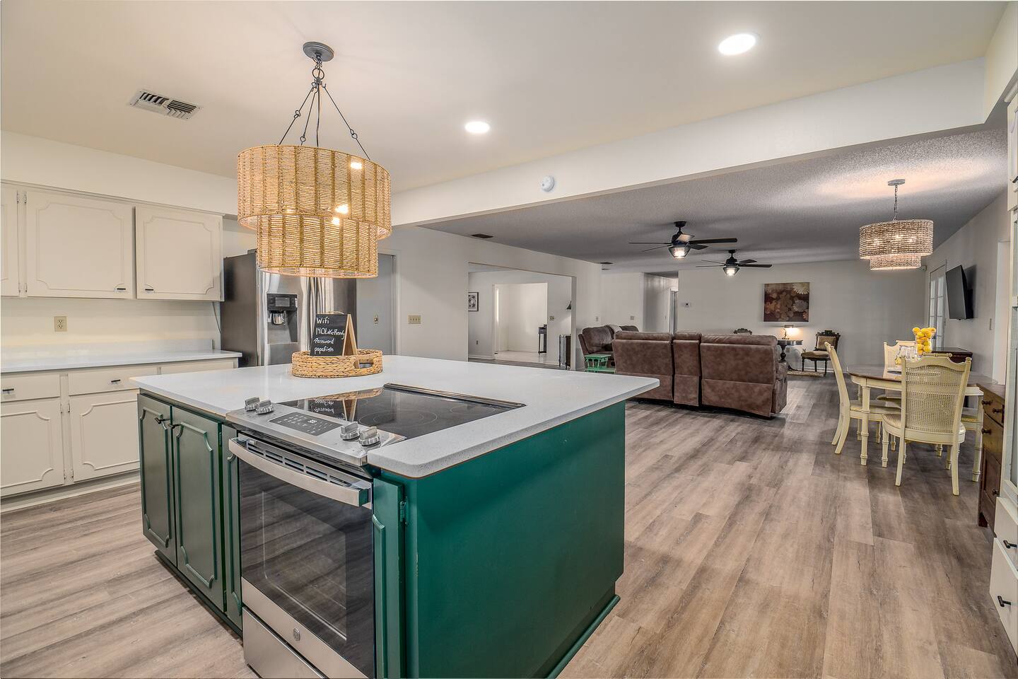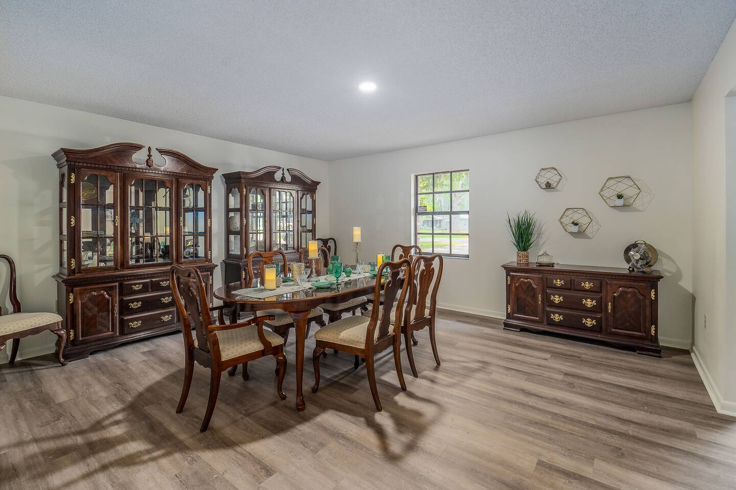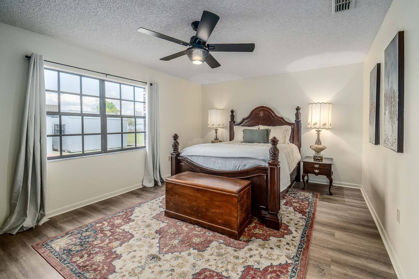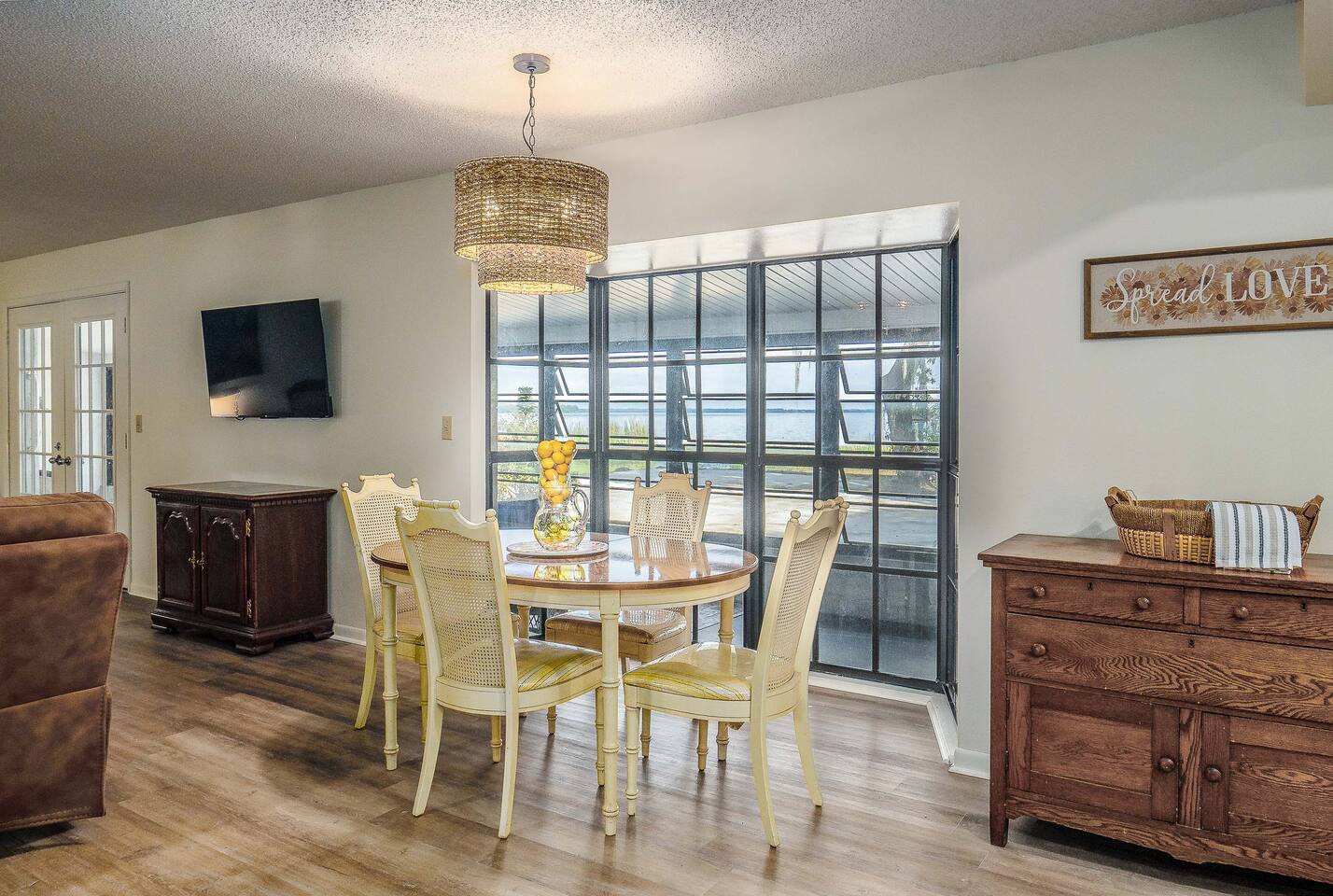 √ Master Bedroom with Ensuite Master Bath - The centerpiece of the modern themed bedroom is a lavish, queen sized bed with a comfy mattress and linens that promise a restful night's sleep. It has a large walk in closet, plenty of storage space for extended stays. It has black-out curtains, which make it great for sleeping in. This room has a smart TV. The Ensuite bath has a shower/tub combo and double sinks. √ Bedroom Two This stylish bedroom comes with a king sized bed with a comfy mattress and linens. It has a large closet and storage space for extended stays. Black-out curtains, great for sleeping in. √ Bedroom Three This bedroom comes with a full sized bed. It also has a large closet and storage space as well as black-out curtains. Quaint antique furniture makes up this adorable bedroom. √ Guest Bathroom: Cute Bathroom with a tub/shower combo. Shampoo, conditioner, body wash and a hair dryer available for use. Plenty of towels available. Double sinks. √ Living Room: Curl up on the cozy couch that has 4 built in recliners and enjoy your favorite show or movie on the screen smart TV. This living room comfortably seats 6 people. The living room offers gorgeous views out the french doors. √ Kitchen: The large open floor plan kitchen is a culinary haven, equipped with everything you need to unleash your inner chef. Whether you're whipping up a meal from scratch or reheating leftovers, you'll find all the tools you need. For coffee enthusiasts, you’ll find a Keurig with a variety of coffees, and creamers. √ Dining Areas: Enjoy the views by the bay window dining area, currently set up for 4, but if you add in the leaf and extra chairs it will seat 6. Or enjoy a family dinner in the formal dining room with seating up to 8. √ Lake Views: Our back yard is the Shore Lines of Lake Reedy. We get stunning sunrises and peaceful moonsets. √ Extras: - Large Patio - Washer and dryer (supplies included) - Pet friendly with paid pet fee!