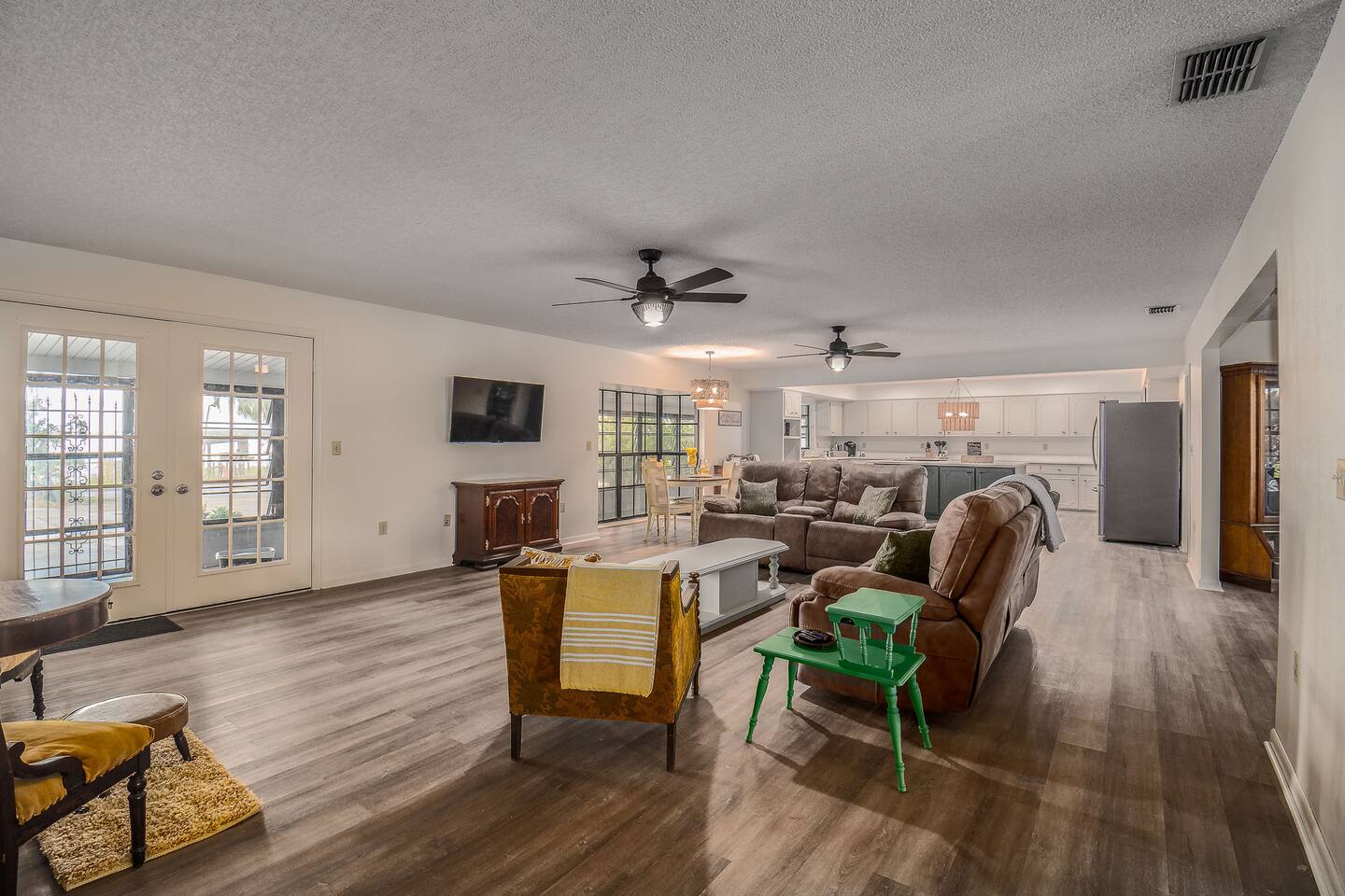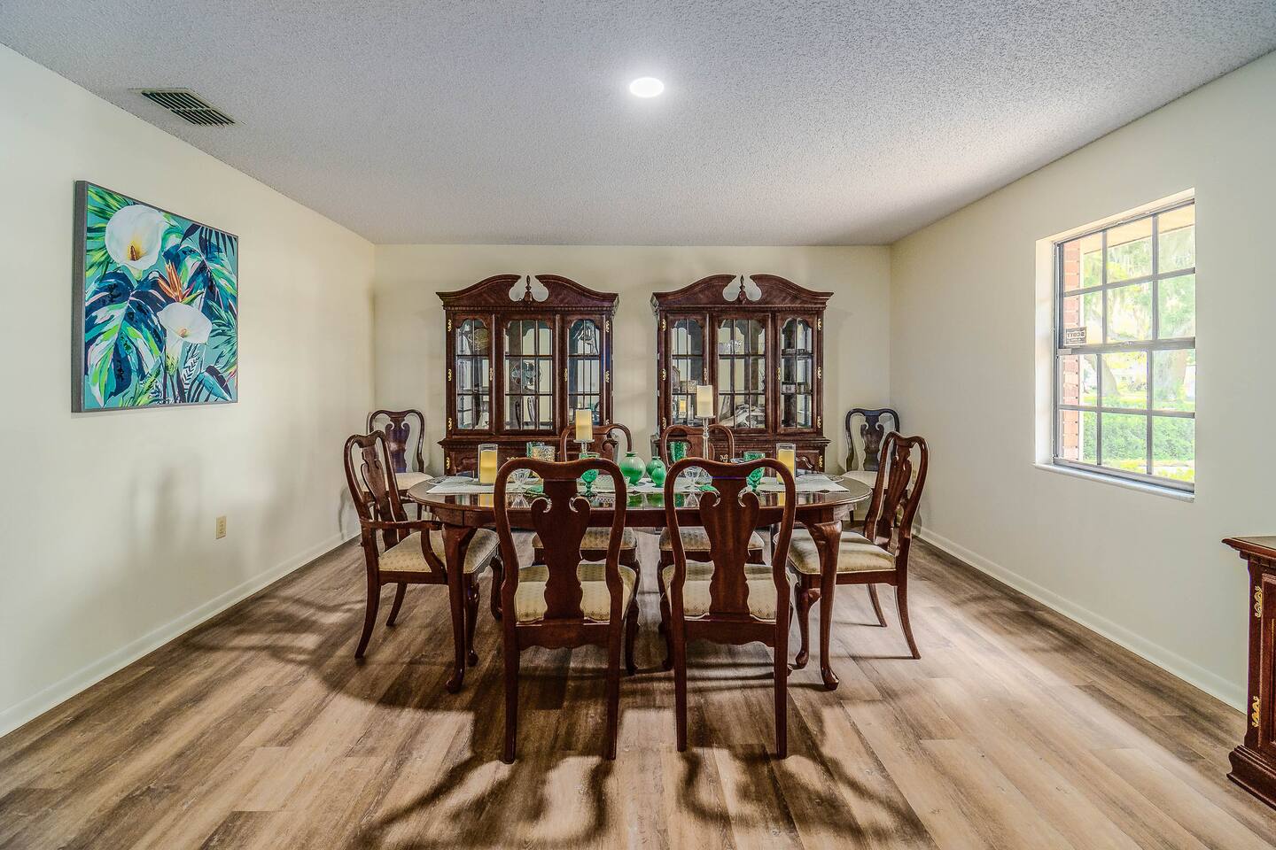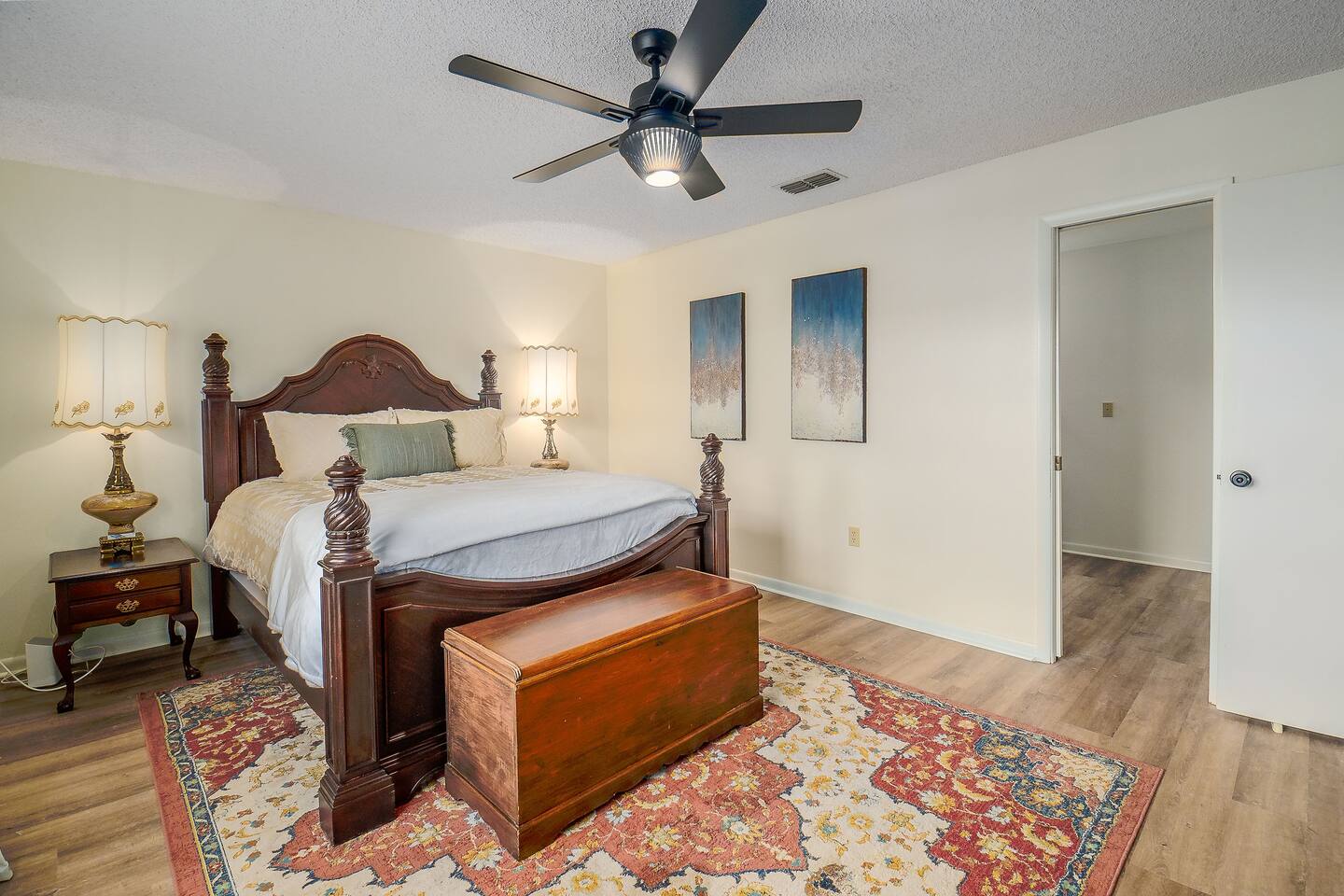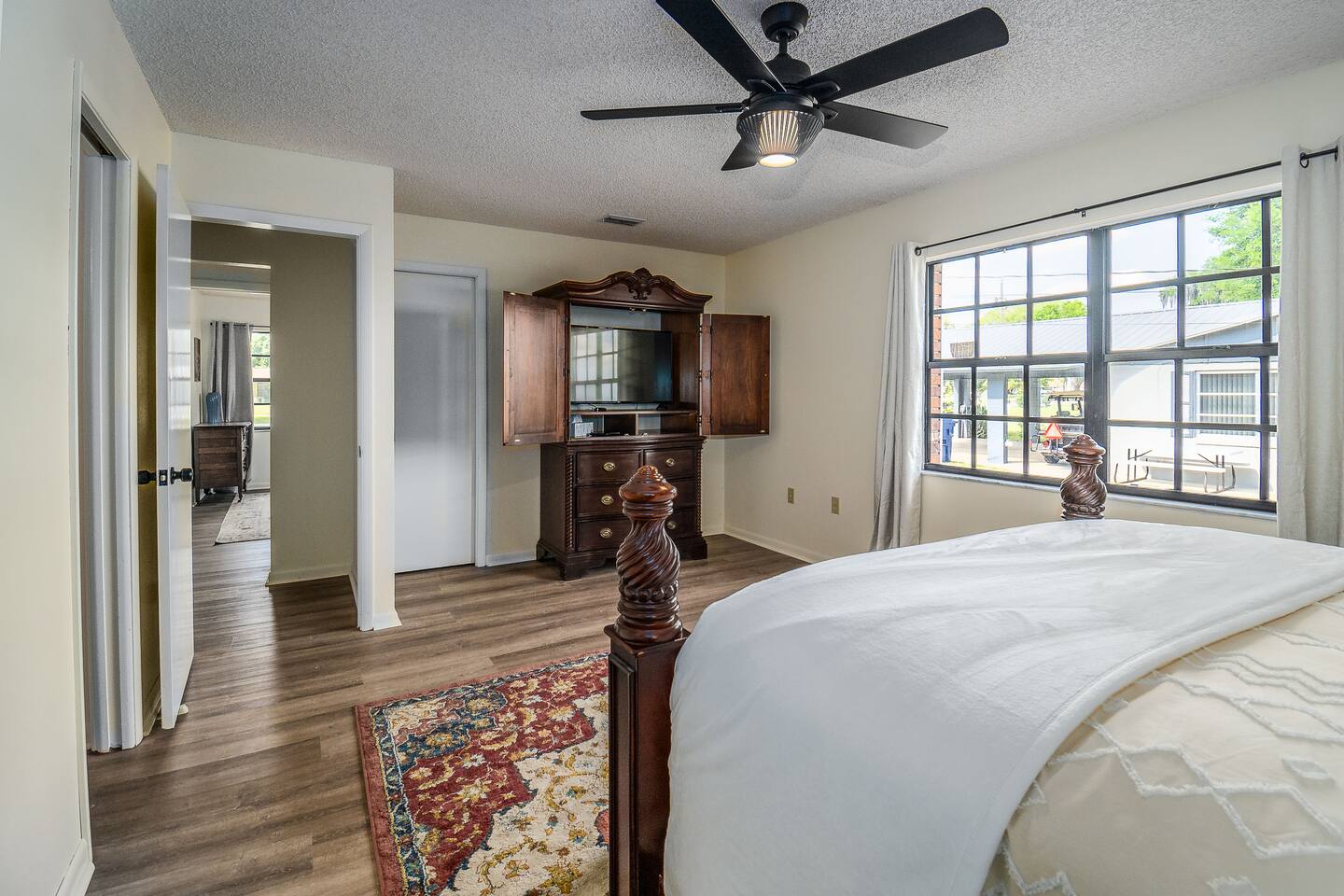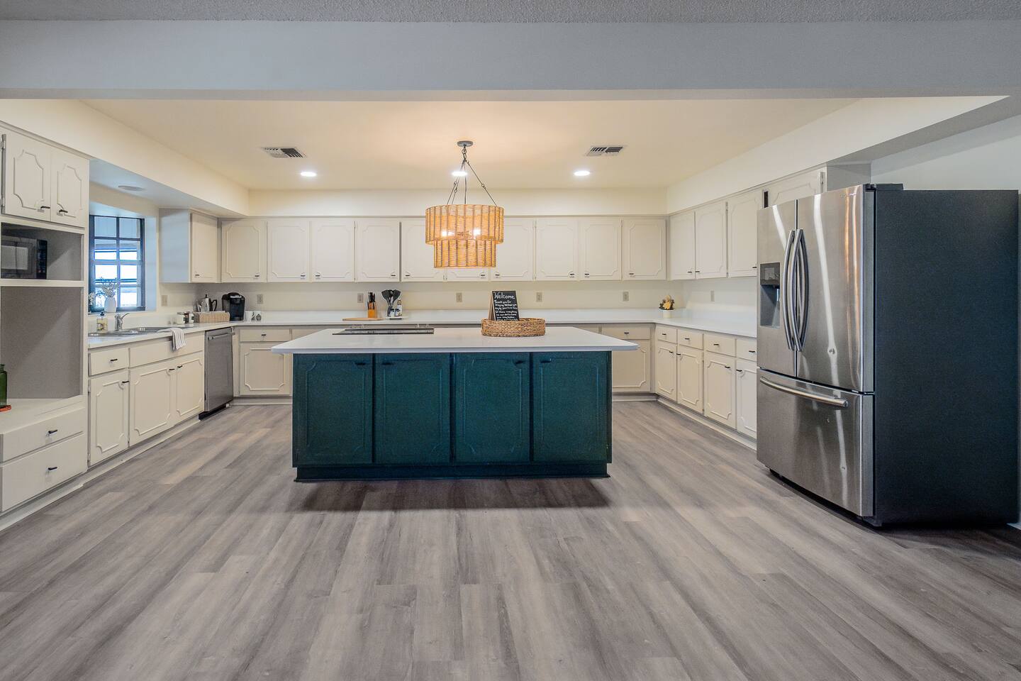 √ Master Bedroom with Ensuite Master Bath - The centerpiece of the modern themed bedroom is a lavish, queen sized bed with a comfy mattress and linens that promise a restful night's sleep. It has a large walk in closet, plenty of storage space for extended stays. It has black-out curtains, which make it great for sleeping in. This room has a smart TV. The Ensuite bath has a shower/tub combo and double sinks. √ Bedroom Two This stylish bedroom comes with a king sized bed with a comfy mattress and linens. It has a large closet and storage space for extended stays. Black-out curtains, great for sleeping in. √ Bedroom Three This bedroom comes with a full sized bed. It also has a large closet and storage space as well as black-out curtains. Quaint antique furniture makes up this adorable bedroom. √ Guest Bathroom: Cute Bathroom with a tub/shower combo. Shampoo, conditioner, body wash and a hair dryer available for use. Plenty of towels available. Double sinks. √ Living Room: Curl up on the cozy couch that has 4 built in recliners and enjoy your favorite show or movie on the screen smart TV. This living room comfortably seats 6 people. The living room offers gorgeous views out the french doors. √ Kitchen: The large open floor plan kitchen is a culinary haven, equipped with everything you need to unleash your inner chef. Whether you're whipping up a meal from scratch or reheating leftovers, you'll find all the tools you need. For coffee enthusiasts, you’ll find a Keurig with a variety of coffees, and creamers. √ Dining Areas: Enjoy the views by the bay window dining area, currently set up for 4, but if you add in the leaf and extra chairs it will seat 6. Or enjoy a family dinner in the formal dining room with seating up to 8. √ Lake Views: Our back yard is the Shore Lines of Lake Reedy. We get stunning sunrises and peaceful moonsets. √ Extras: - Large Patio - Washer and dryer (supplies included) - Pet friendly with paid pet fee!