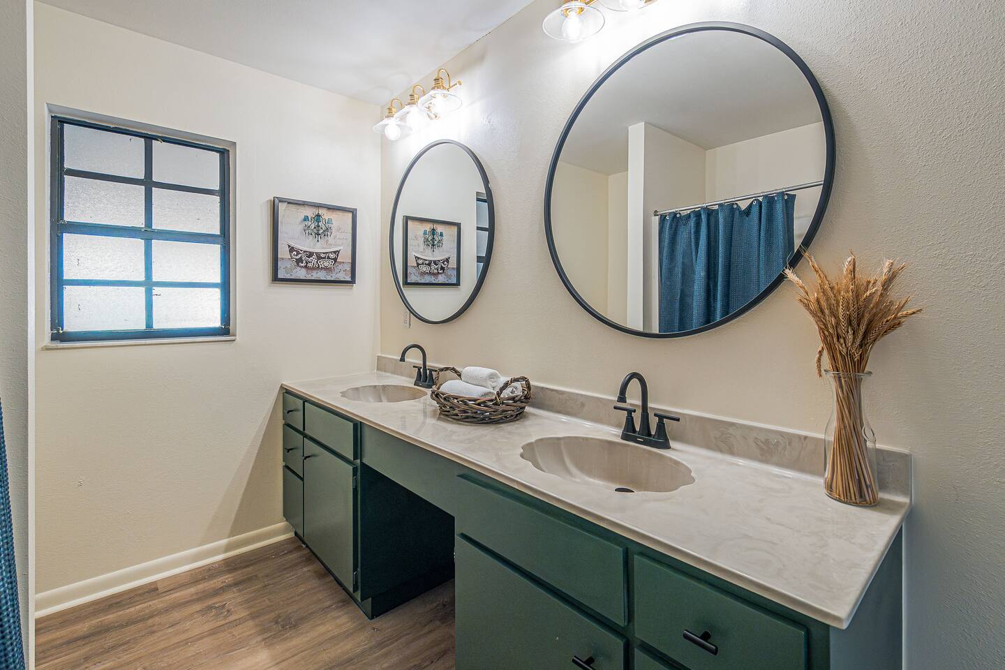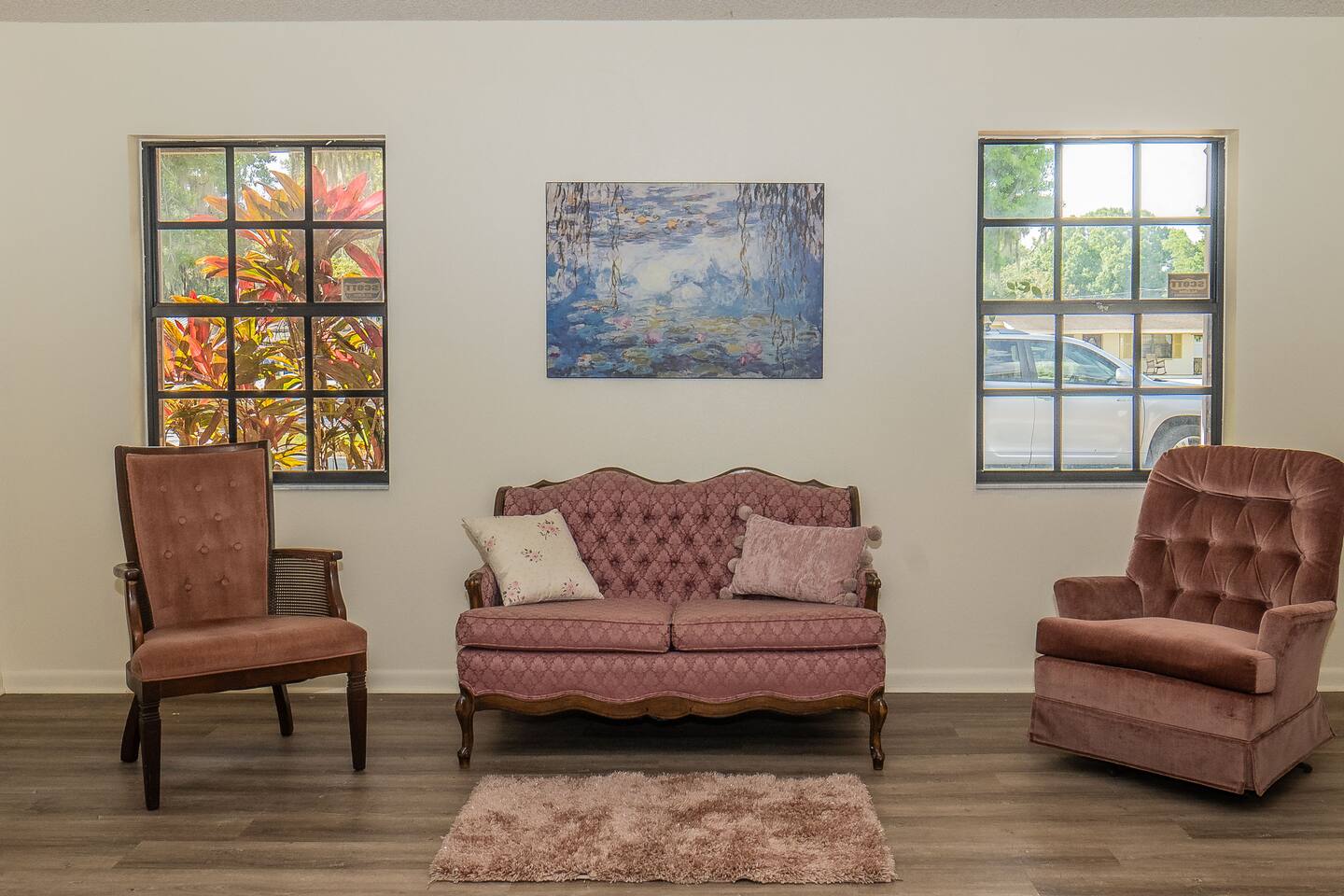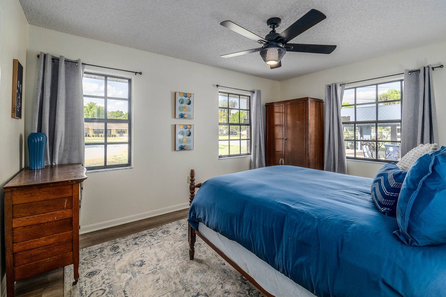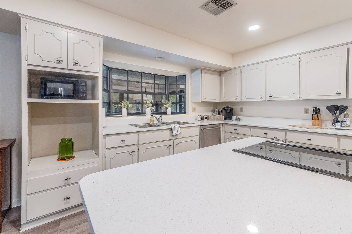 √ Master Bedroom with Ensuite Master Bath - The centerpiece of the modern themed bedroom is a lavish, queen sized bed with a comfy mattress and linens that promise a restful night's sleep. It has a large walk in closet, plenty of storage space for extended stays. It has black-out curtains, which make it great for sleeping in. This room has a smart TV. The Ensuite bath has a shower/tub combo and double sinks. √ Bedroom Two This stylish bedroom comes with a king sized bed with a comfy mattress and linens. It has a large closet and storage space for extended stays. Black-out curtains, great for sleeping in. √ Bedroom Three This bedroom comes with a full sized bed. It also has a large closet and storage space as well as black-out curtains. Quaint antique furniture makes up this adorable bedroom. √ Guest Bathroom: Cute Bathroom with a tub/shower combo. Shampoo, conditioner, body wash and a hair dryer available for use. Plenty of towels available. Double sinks. √ Living Room: Curl up on the cozy couch that has 4 built in recliners and enjoy your favorite show or movie on the screen smart TV. This living room comfortably seats 6 people. The living room offers gorgeous views out the french doors. √ Kitchen: The large open floor plan kitchen is a culinary haven, equipped with everything you need to unleash your inner chef. Whether you're whipping up a meal from scratch or reheating leftovers, you'll find all the tools you need. For coffee enthusiasts, you’ll find a Keurig with a variety of coffees, and creamers. √ Dining Areas: Enjoy the views by the bay window dining area, currently set up for 4, but if you add in the leaf and extra chairs it will seat 6. Or enjoy a family dinner in the formal dining room with seating up to 8. √ Lake Views: Our back yard is the Shore Lines of Lake Reedy. We get stunning sunrises and peaceful moonsets. √ Extras: - Large Patio - Washer and dryer (supplies included) - Pet friendly with paid pet fee!