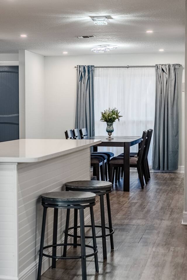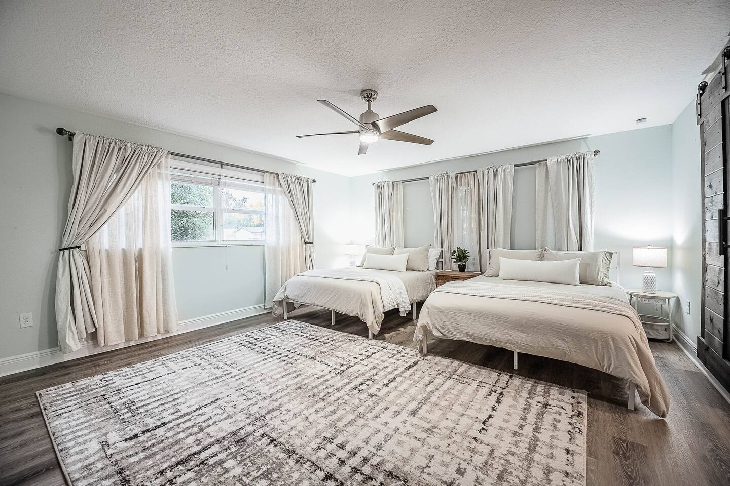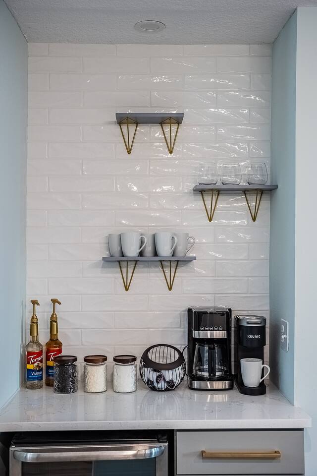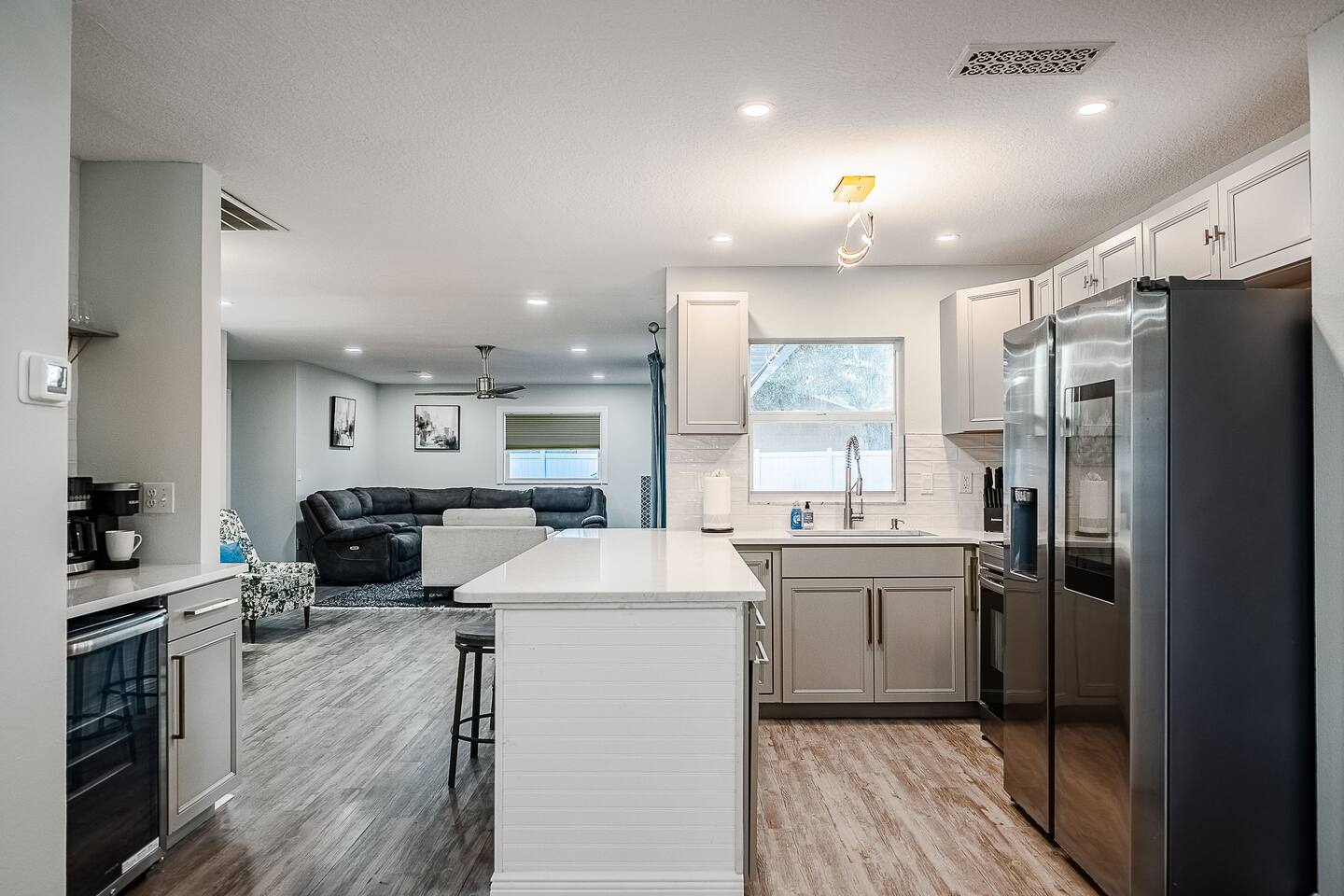 √ Location: Located in the Heart of Downtown Lakeland ! 2.9 Miles to Florida Southern College Miles to South Eastern University 3.5 Miles to Downtown Lakeland 3.1 Miles to Lake Morton 2.6 Miles to Lake Hollingsworth 3.4 Miles to RP Funding Center 4.6 Miles to Bonnet Springs Park 1.8 Miles to Common Ground Playground √ Bedroom One - The centerpiece of the modern themed bedroom is a lavish, king sized bed with a comfy mattress and linens that promise a restful night's sleep. It has a Luggage racks and a place to hang or fold your clothes, great for extended stays. It has black-out curtains, which make it great for sleeping in. Smart TV. End tables with charging stations. √ Ensuite Primary Bath - Walk in shower with a rain shower head and body jets. Plenty of towels, shampoo conditioner and body wash, and a hair dryer. √ Bedroom Two - This converted living room is made into a private bedroom with two large barn doors. Two Queen beds, luggage racks, clothing rack and dresser. This room has blackout curtains and a smart TV. End tables with charging stations √ Bedroom three and four : Both of these Bedrooms have Queen Beds, closets, luggage racks, smart TV's and end tables with charging stations. √ Guest Bath - Shower and Bathtub Combo. Plenty of towels, shampoo conditioner and body wash, and a hair dryer. √ Living Room: Curl up on the oversized couch with electric recliners or the comfy arm chair and enjoy your favorite show or movie on the large screen smart TV. This living room comfortably seats 8-10 people. The fireplace is decorative only. An additional work station set up for remote work or homeschoolers. √ Kitchen: The kitchen is a culinary haven, equipped with everything you need to unleash your inner chef. Whether you're whipping up a meal from scratch or reheating leftovers, you'll find all the tools you need. For coffee enthusiasts, you’ll find a Keurig and Drip Coffee Maker with a variety of coffees, cream, syrup & sugar. √ Extras: - Fenced in Backyard with Private Patio - Plenty of Parking - Bar Seating for 2 - Dining Table for 6 - Fenced in Back Yard - Washer and dryer in the garage (supplies included) no