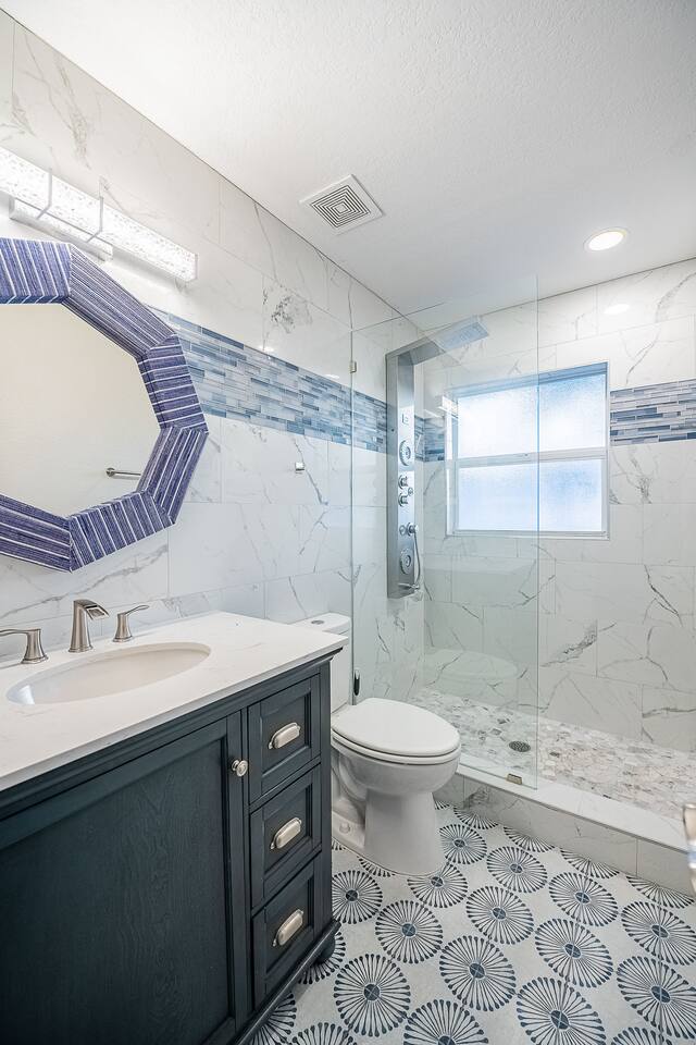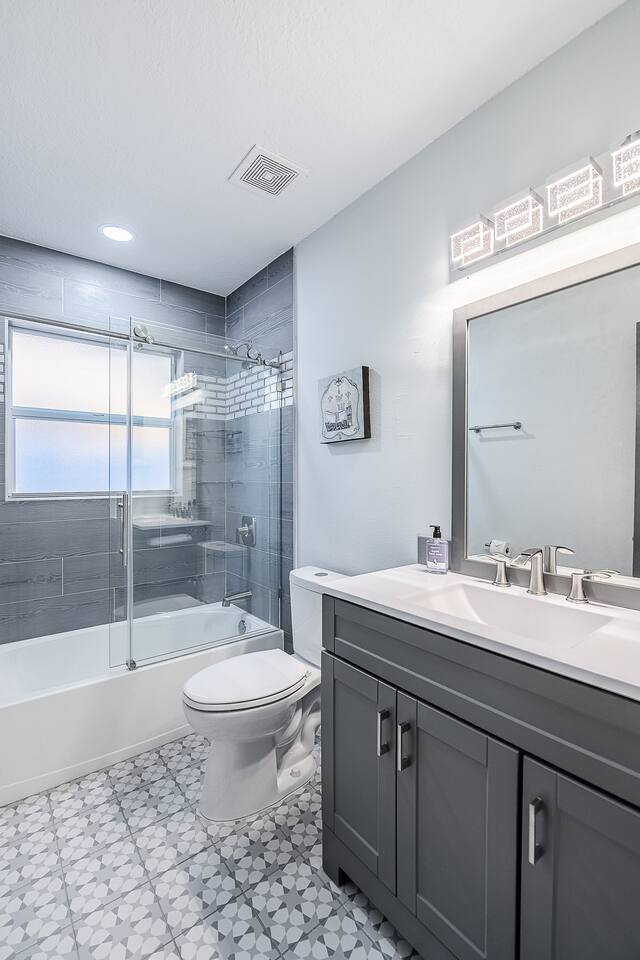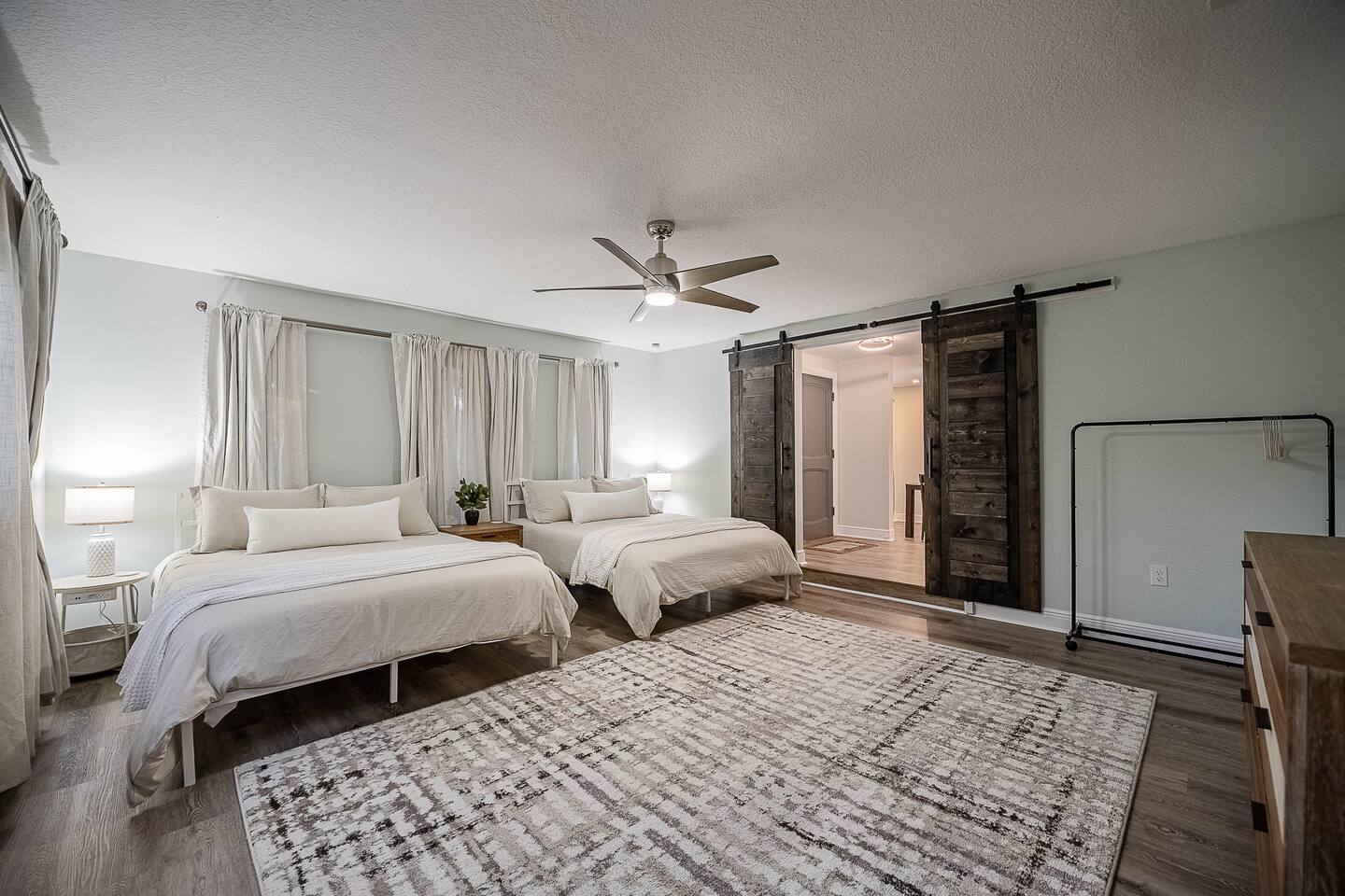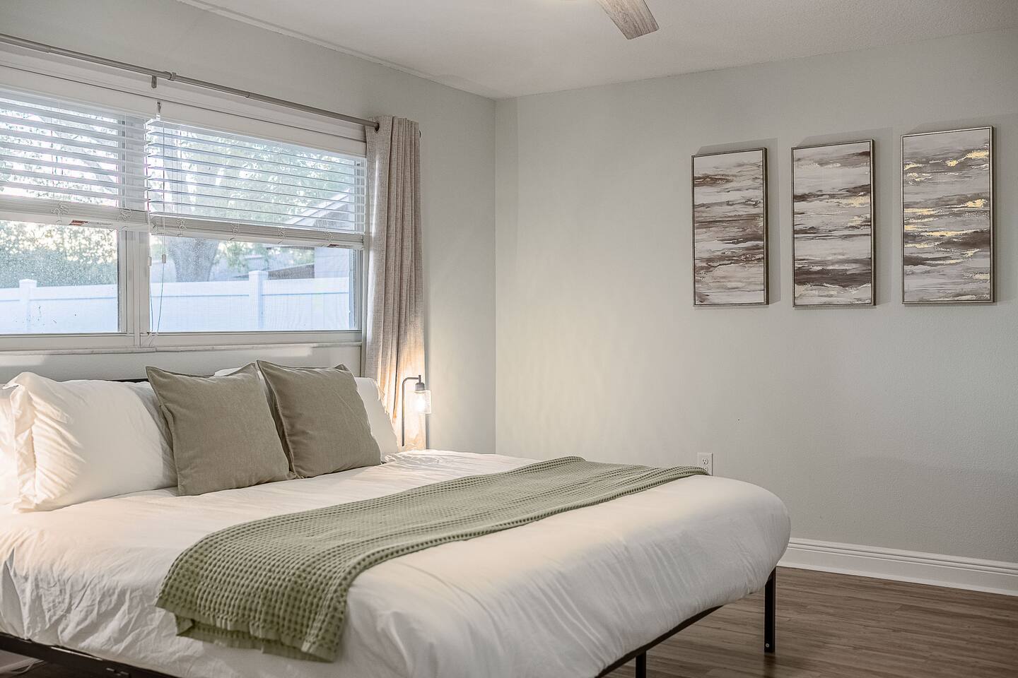 √ Location: Located in the Heart of Downtown Lakeland ! 2.9 Miles to Florida Southern College Miles to South Eastern University 3.5 Miles to Downtown Lakeland 3.1 Miles to Lake Morton 2.6 Miles to Lake Hollingsworth 3.4 Miles to RP Funding Center 4.6 Miles to Bonnet Springs Park 1.8 Miles to Common Ground Playground √ Bedroom One - The centerpiece of the modern themed bedroom is a lavish, king sized bed with a comfy mattress and linens that promise a restful night's sleep. It has a Luggage racks and a place to hang or fold your clothes, great for extended stays. It has black-out curtains, which make it great for sleeping in. Smart TV. End tables with charging stations. √ Ensuite Primary Bath - Walk in shower with a rain shower head and body jets. Plenty of towels, shampoo conditioner and body wash, and a hair dryer. √ Bedroom Two - This converted living room is made into a private bedroom with two large barn doors. Two Queen beds, luggage racks, clothing rack and dresser. This room has blackout curtains and a smart TV. End tables with charging stations √ Bedroom three and four : Both of these Bedrooms have Queen Beds, closets, luggage racks, smart TV's and end tables with charging stations. √ Guest Bath - Shower and Bathtub Combo. Plenty of towels, shampoo conditioner and body wash, and a hair dryer. √ Living Room: Curl up on the oversized couch with electric recliners or the comfy arm chair and enjoy your favorite show or movie on the large screen smart TV. This living room comfortably seats 8-10 people. The fireplace is decorative only. An additional work station set up for remote work or homeschoolers. √ Kitchen: The kitchen is a culinary haven, equipped with everything you need to unleash your inner chef. Whether you're whipping up a meal from scratch or reheating leftovers, you'll find all the tools you need. For coffee enthusiasts, you’ll find a Keurig and Drip Coffee Maker with a variety of coffees, cream, syrup & sugar. √ Extras: - Fenced in Backyard with Private Patio - Plenty of Parking - Bar Seating for 2 - Dining Table for 6 - Fenced in Back Yard - Washer and dryer in the garage (supplies included) no