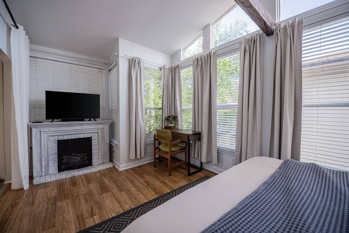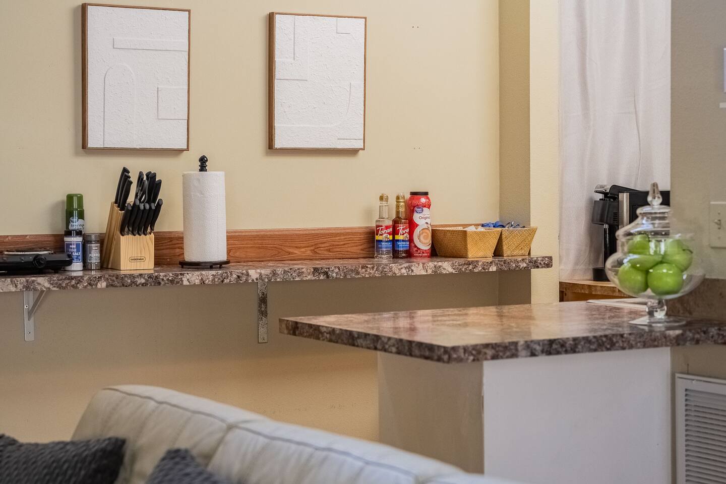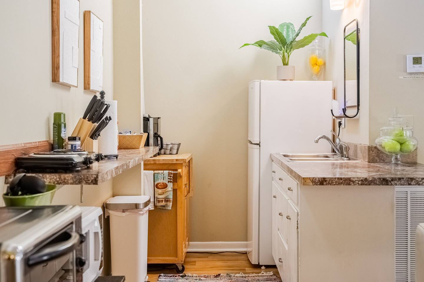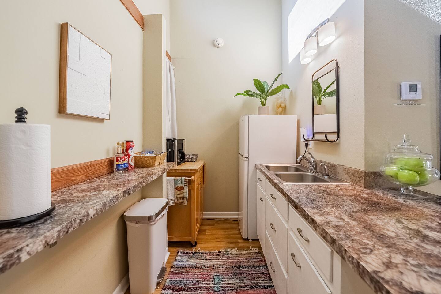 √ Bedroom One Queen sized bed with soft linens and a cozy mattress that promises a restful night's sleep. It has black-out curtains to reduce the large window light, although some light still comes in from the upper windows. Roku smart TV. Work Station desk for computer work. (there is not a traditional bedroom door as this room was converted to a large bedroom. We do have heavy curtain for privacy at the entrance to this room) √ Bedroom Two: This chic bedroom comes with a queen sized bed with soft linens and a cozy mattress. √ Living Room: Relaxation takes center stage in the living room. Select your favorite movie or tv show on the Smart TV. The large vaulted seating and warm lighting makes this a perfect place to lounge. √ Kitchenette: The kitchenette is equipped with a camping style 2 burner counter top stove, toaster oven, crock pot, blender, microwave and of course coffee! Our coffee bar offers ground coffee, keurig pods, cream, sugar, and coffee syrups. Whether you're whipping up a meal from scratch or reheating leftovers, you'll find all the tools you need. √ Bathroom Full size bathroom with a walk in shower. We provide towels, hand towels, wash cloths, and a hair dryer. Shampoo, conditioner, and body wash is also provided. √ Extras: - Gorgeous and unique spiral staircase entrance! Please be advised that it is a tight stairway and large luggage can be challenging (But not impossible!) to bring up the stairs. These stairs may also be difficult for young children. - Dining room table for 4 - Private Outdoor Patio Space with a fire pit, seating for four plus two additional sun lounge chairs. - Driveway can accommodate 2 vehicles side by side. - Washer and dryer with supplies included We do have long term tenants in the downstairs unit, who are extremely respectful of our guests, but there is potential for minor noise.
