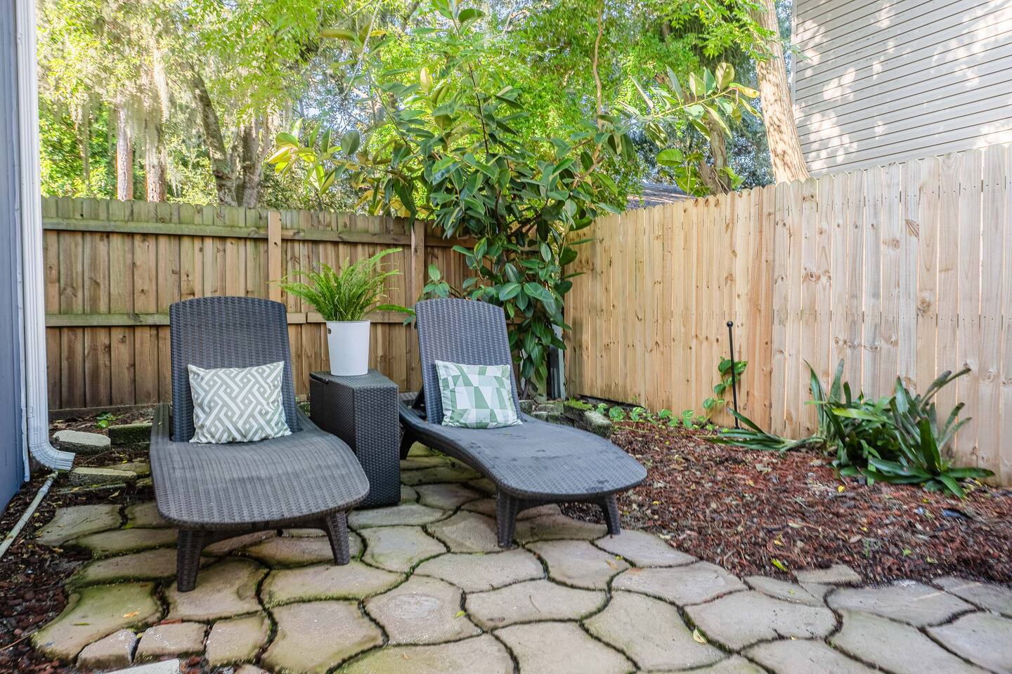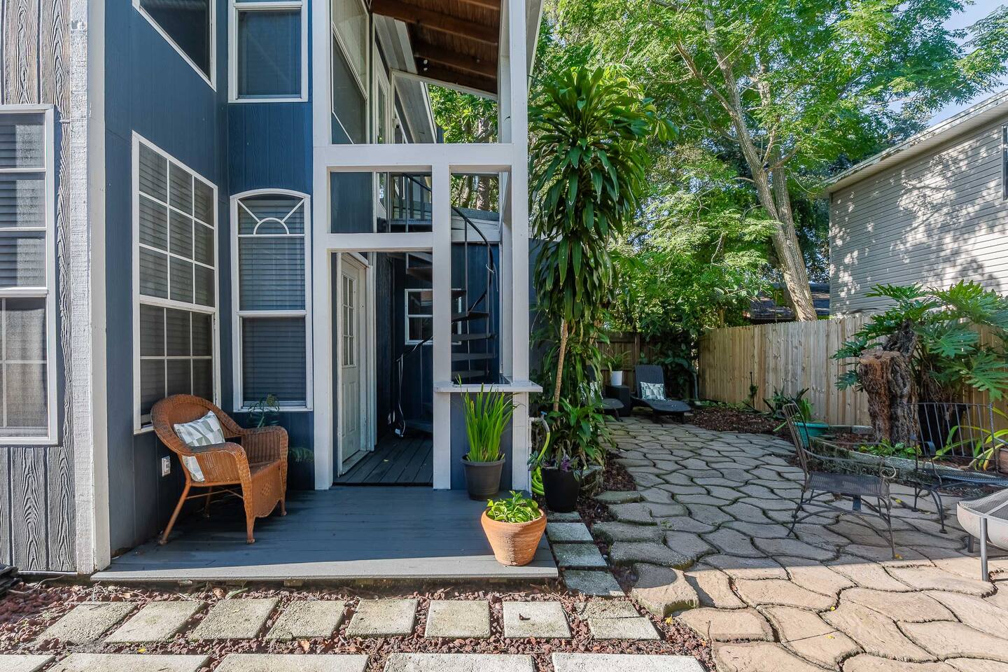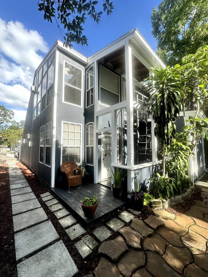 Welcome to the Loft at Raintree! Enter through the stunning spiral staircase into a bright two-bedroom, one-bath retreat with vaulted ceilings and plenty of natural light. Enjoy your mornings at the coffee bar, stocked with coffee, cream, sugar, and coffee syrups, or lounge in our private backyard oasis. We promise to deliver a relaxing stay! Located just minutes from Lake Hollingsworth and Downtown Lakeland, you’ll be close to scenic walks, dining, and entertainment.