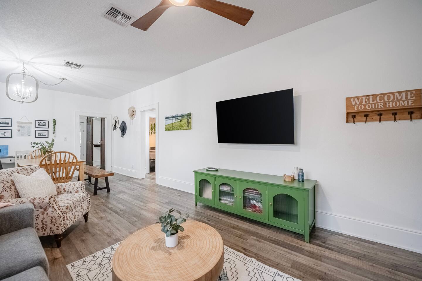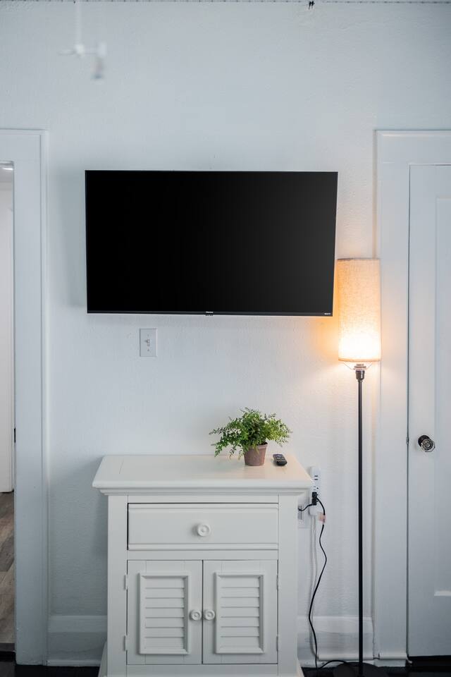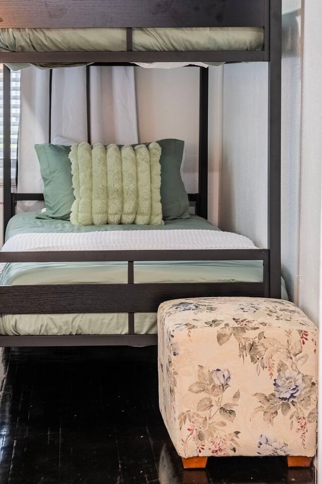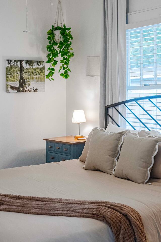√ Bedroom One - The centerpiece of the modern themed bedroom is a lavish, king sized bed with a comfy mattress and linens that promise a restful night's sleep. It has a closet with extra pillows and blankets, full size mirror, black out blinds for restful sleep and a smart TV. √ Bedroom Two - This bedroom has three beds. One queen size bed and a twin bunk bed. This room is a Starry night theme and the little ones absolutely love it. This bedroom also has a smart TV. In the closet is a pack n play for the littlest visitors. Black out curtains for sleeping in! √ Queen Size Sleeper Sofa - The living room has a pull out queen size sleeper sofa from Ashley furniture. The mattress is comfortable and we have plenty of extra linens and pillows available. √ Full Bathroom - Walk in shower only, but we also have a baby bath available for use. We supply towels, shampoo, conditioner, and body wash by Ginger Lily Farms. √ Living Room: This open floor plans allows for plenty of natural light. Enjoy a day in playing board games, watching a movie on the large smart TV, or give our scavenger hunt a go. Additional work station set up for remote workers or homeschoolers. √ Kitchen: The kitchen is a culinary haven, equipped with everything you need to unleash your inner chef. Whether you're whipping up a meal from scratch or reheating leftovers, you'll find all the tools you need. For coffee enthusiasts, you’ll find a Keurig, Drip Coffee Maker, Pour Over Coffee, and a Coffee Frappe Machine! Coffees, cream & sugar supplied. √ Outdoor Space: Take advantage of the s'mores kit provided in our backyard oasis. Outdoor seating, propane fire pit, and backyard games. Or rock in the rocking chairs on the classic front porch of our quite neighborhood. √ Extras: - Plenty of Parking - Conversation Room - Dining Table for 6 - Fenced in Back Yard - Washer and dryer (supplies included) √ Location - Local Spots: 2.4 Miles to Lake Morton 2.4 Miles to Florida Southern College 2.6 Miles to the Center of Downtown Lakeland 2.7 Miles to the RP Funding Center (Civic Center) 1.8 Miles to Lake Hollingsworth 5.2 Miles to Bonnet Spring Park Florida Attractions: 21 Miles to Legoland 42 Miles to Walt Disney World 59 Miles to Clearwater Beach 35 Miles to Busch Gardens Tampa Bay 94 Miles to Kennedy Space Center