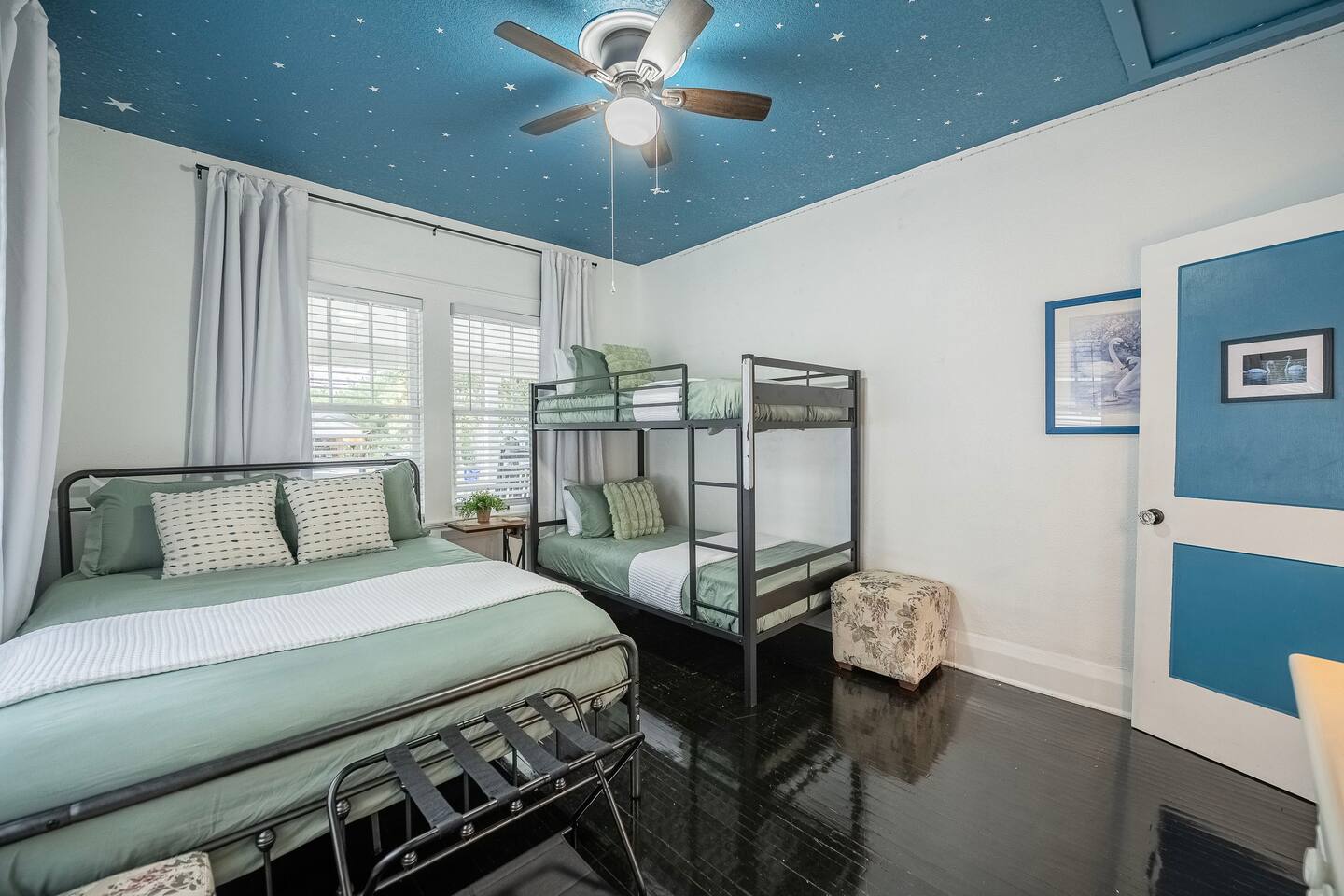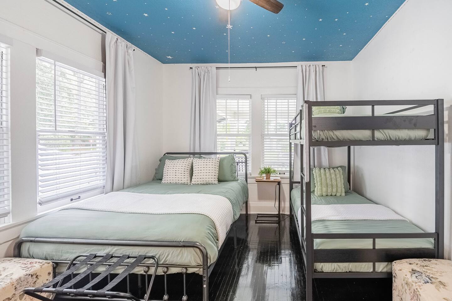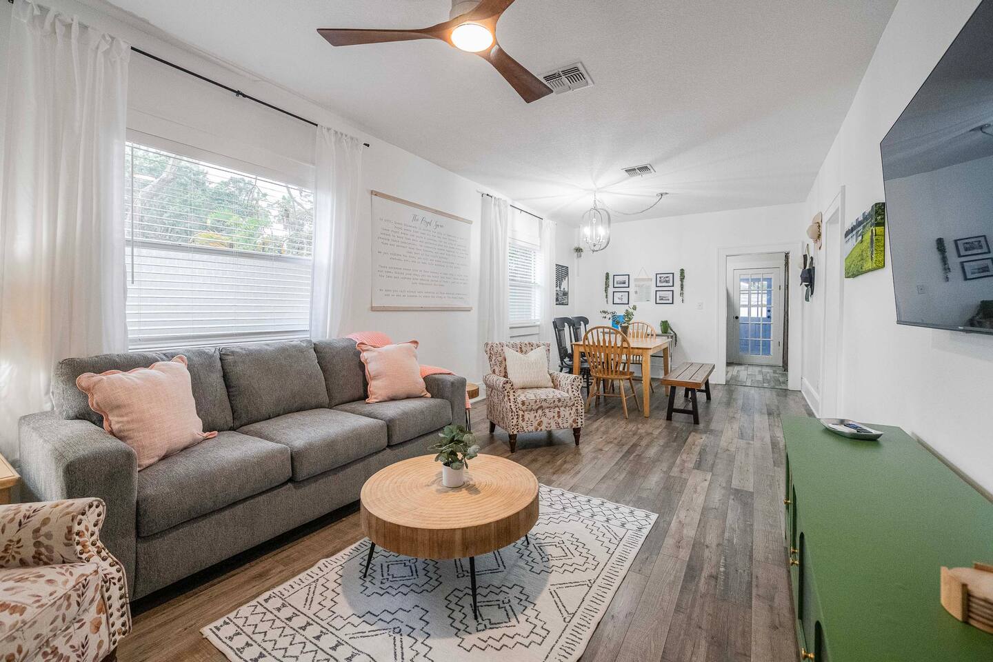 √ Bedroom One - The centerpiece of the modern themed bedroom is a lavish, king sized bed with a comfy mattress and linens that promise a restful night's sleep. It has a closet with extra pillows and blankets, full size mirror, black out blinds for restful sleep and a smart TV. √ Bedroom Two - This bedroom has three beds. One queen size bed and a twin bunk bed. This room is a Starry night theme and the little ones absolutely love it. This bedroom also has a smart TV. In the closet is a pack n play for the littlest visitors. Black out curtains for sleeping in! √ Queen Size Sleeper Sofa - The living room has a pull out queen size sleeper sofa from Ashley furniture. The mattress is comfortable and we have plenty of extra linens and pillows available. √ Full Bathroom - Walk in shower only, but we also have a baby bath available for use. We supply towels, shampoo, conditioner, and body wash by Ginger Lily Farms. √ Living Room: This open floor plans allows for plenty of natural light. Enjoy a day in playing board games, watching a movie on the large smart TV, or give our scavenger hunt a go. Additional work station set up for remote workers or homeschoolers. √ Kitchen: The kitchen is a culinary haven, equipped with everything you need to unleash your inner chef. Whether you're whipping up a meal from scratch or reheating leftovers, you'll find all the tools you need. For coffee enthusiasts, you’ll find a Keurig, Drip Coffee Maker, Pour Over Coffee, and a Coffee Frappe Machine! Coffees, cream & sugar supplied. √ Outdoor Space: Take advantage of the s'mores kit provided in our backyard oasis. Outdoor seating, propane fire pit, and backyard games. Or rock in the rocking chairs on the classic front porch of our quite neighborhood. √ Extras: - Plenty of Parking - Conversation Room - Dining Table for 6 - Fenced in Back Yard - Washer and dryer (supplies included) √ Location - Local Spots: 2.4 Miles to Lake Morton 2.4 Miles to Florida Southern College 2.6 Miles to the Center of Downtown Lakeland 2.7 Miles to the RP Funding Center (Civic Center) 1.8 Miles to Lake Hollingsworth 5.2 Miles to Bonnet Spring Park Florida Attractions: 21 Miles to Legoland 42 Miles to Walt Disney World 59 Miles to Clearwater Beach 35 Miles to Busch Gardens Tampa Bay 94 Miles to Kennedy Space Center