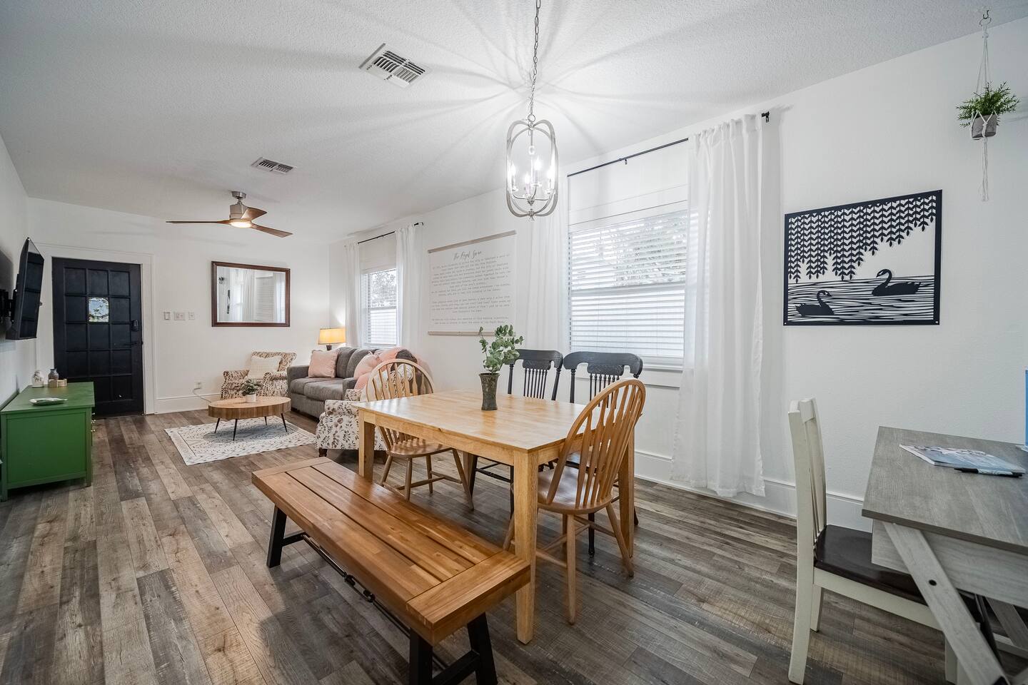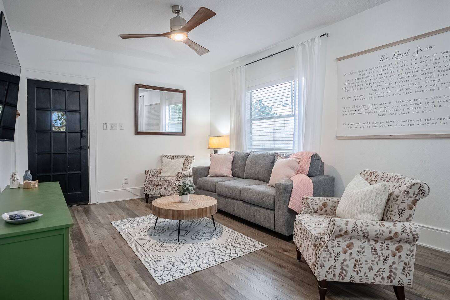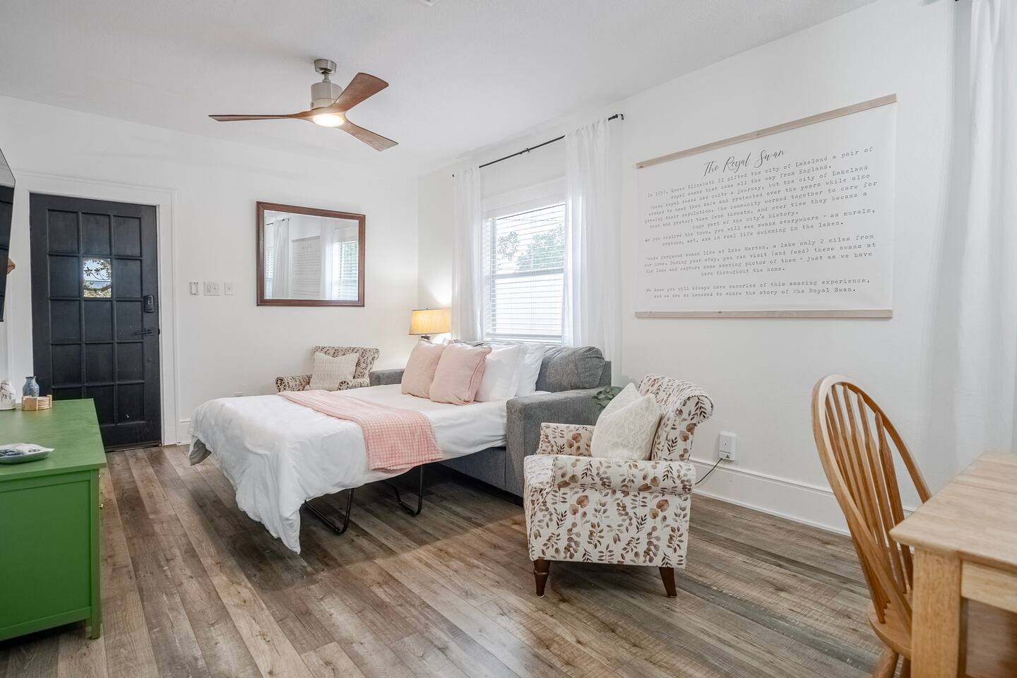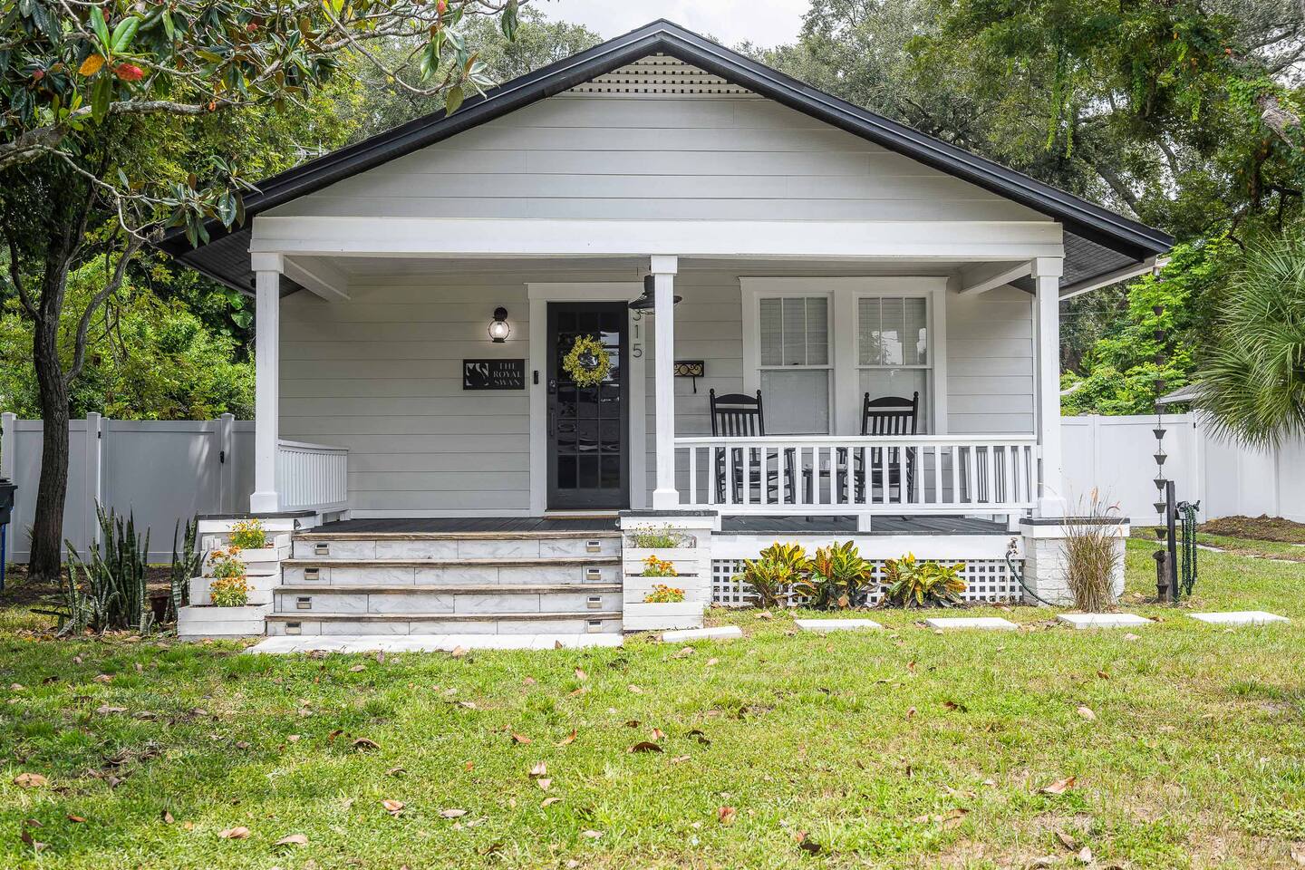 The Royal Swan is a gorgeously remodeled bungalow in Downtown Lakeland, sleeping up to 6 guests and pet friendly! The two-bedrooms feature modern decor with maximum comfort in mind! Spacious living area, dining for 6, work space, and a fully equipped kitchen. The fenced-in backyard or the classic front porch is perfect for relaxation. Centrally located, making it perfect for exploring all that Lakeland and the surrounding areas have to offer. Come be our Guest! We are excited to host you!